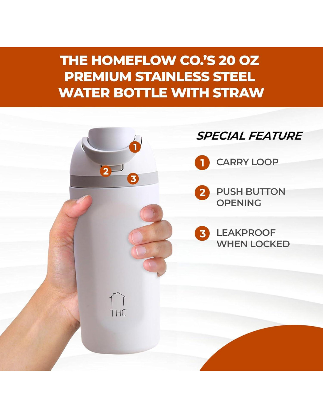 - [TAPA DE ACCESO RÁPIDO] Nuestra botella de agua de acero inoxidable con tapa abatible asegura un acceso rápido y fácil a tus bebidas favoritas sin derramar una gota. Perfecta para estilos de vida ocupados, esta característica hace que la hidratación sea sin complicaciones