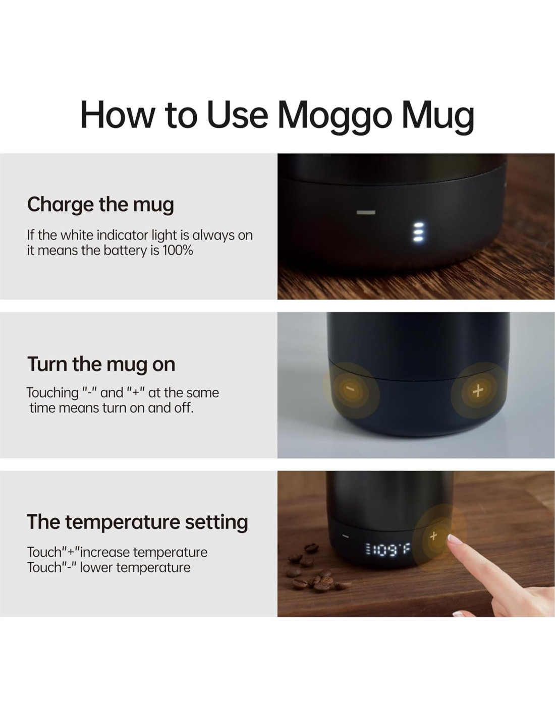 - USO PREVISTO: La taza de café digital Muggo está diseñada para mantener un líquido ya caliente y no para recalentar líquido desde temperatura ambiente, hacerlo disminuirá drásticamente su duración de batería