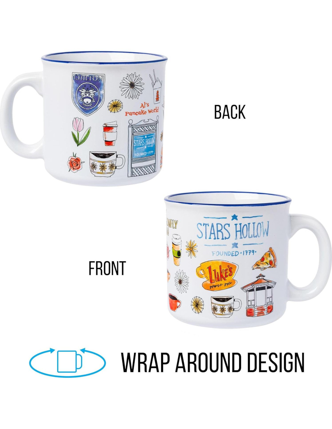 - UN SABOR DE STARS HOLLOW: Esta encantadora taza presenta ubicaciones icónicas de Stars Hollow, incluyendo el Diner de Luke, el Mundo de Pancakes de Al, el gazebo y muchas más. Stars Hollow y su fecha de fundación están escritos en la parte frontal de la taza en una hermosa impresión.