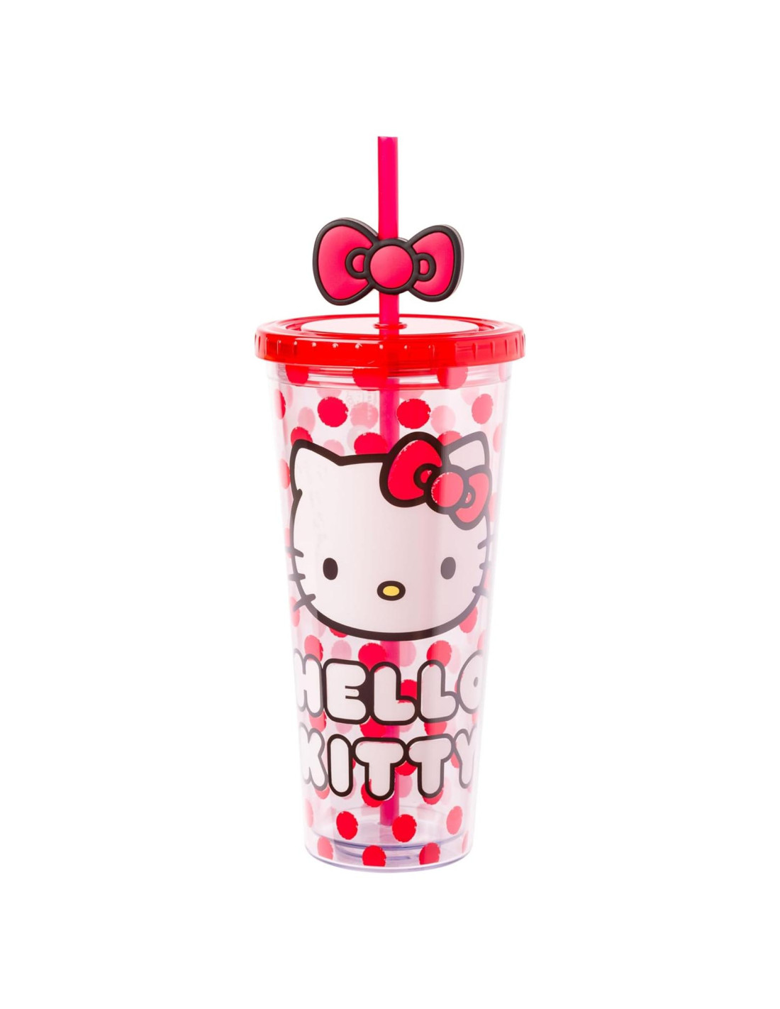 - HELLO KITTY: La taza fría presenta la cara de Hello Kitty contra un fondo de lunares rojos. Escrito debajo del querido personaje está su nombre, 'Hello Kitty'. La taza cuenta con una tapa roja y una pajilla. La pajilla tiene un lazo rojo como un adorable adorno.