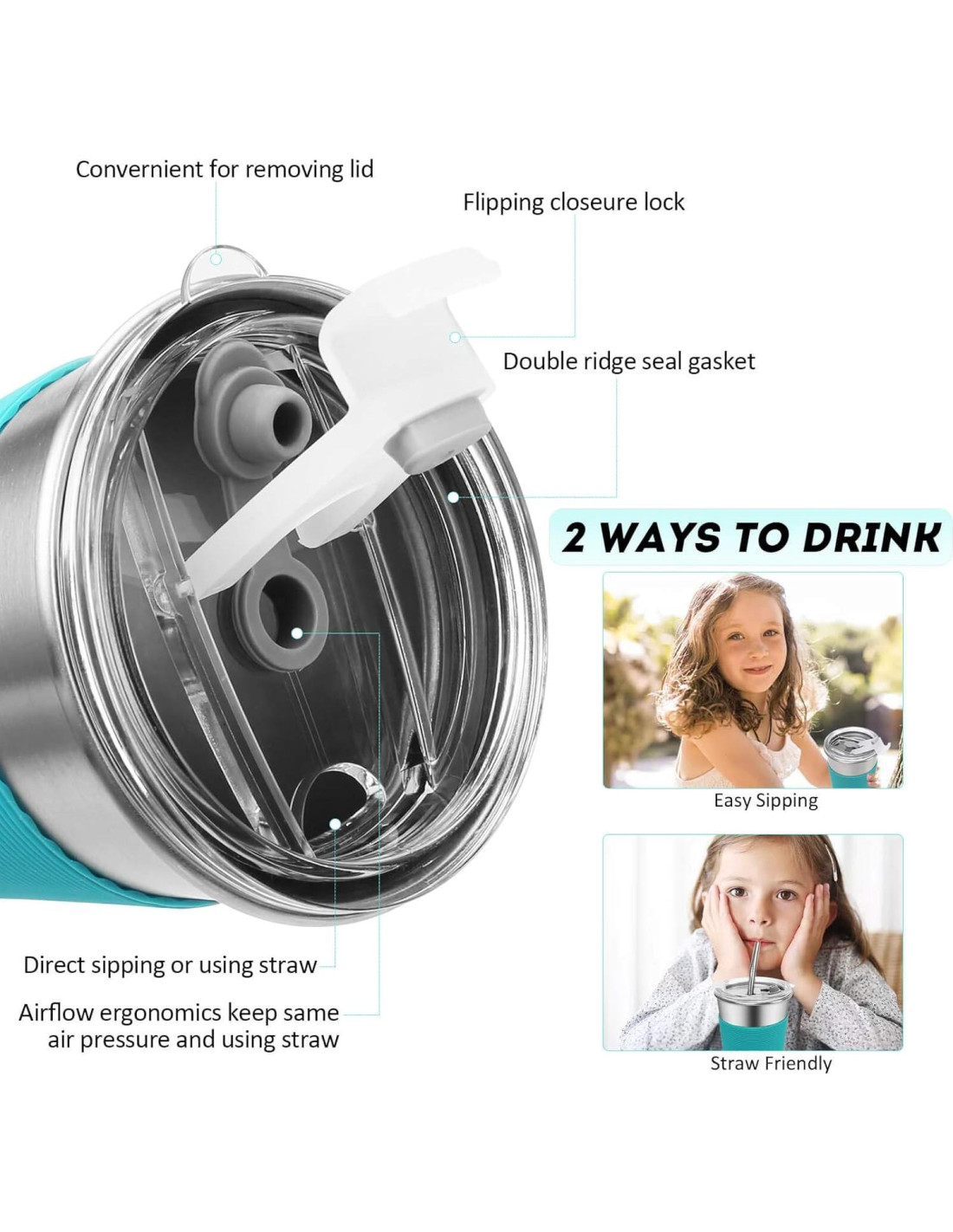 - A prueba de derrames y Pajita: El anillo de sellado de silicona en la tapa hace que las tazas de acero inoxidable para niños pequeños sean a prueba de derrames. Cuando cierras las tapas, la taza con pajita puede ser a prueba de derrames incluso cuando se vuelca. Las tapas 2 en 1 proporcionan a las tazas para niños con tapa 2 formas de beber, sorber y beber con pajita.