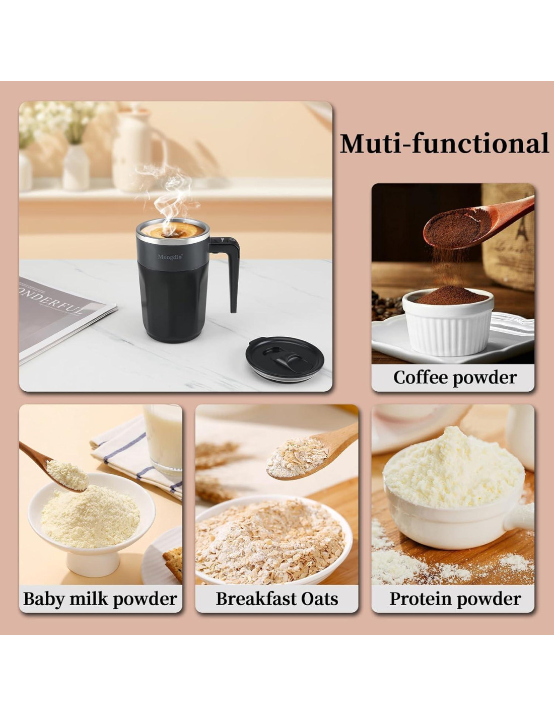 Para los amantes del café, se puede usar para hacer lattes, cappuccinos y otros cafés elegantes. También cuenta con una pantalla de temperatura para un control preciso de las temperaturas de preparación y mezcla para crear bebidas de café con sabor de calidad profesional. Esta taza de mezcla está equipada con un indicador de temperatura y de batería restante, doble clic para comenzar a mezclar y mostrar la batería restante, clic para detener la mezcla y mostrar la temperatura. Se puede cargar utilizando varios puertos USB, como el puerto USB de una computadora o una fuente de alimentación móvil. Al salir de picnic o viajar, incluso si no hay un enchufe, puedes cargar la taza mezcladora y asegurar su uso adecuado llevando una fuente de alimentación móvil contigo. El anillo de silicona antideslizante en la parte inferior de la taza de mezcla hace que la taza sea más estable en todas las superficies planas. Esto reduce efectivamente el riesgo de derrames. El diseño de tapa deslizante es muy fácil de operar con una mano, lo que facilita abrir y cerrar rápidamente la tapa de la taza de mezcla. Ahorra tiempo. También es conveniente para que los usuarios tomen sorbos en cualquier momento. Esta taza de mezcla es adecuada para reuniones familiares, reuniones de amigos y otras ocasiones sociales, puede usarse para hacer rápidamente una variedad de bebidas para satisfacer las diferentes necesidades de sabor de varias personas. También se puede usar al aire libre para agregar comodidad y confort a las actividades de ocio al aire libre. ¿Se aflojará el diseño de la tapa deslizante después de un largo tiempo de uso? El diseño de la tapa deslizante de esta taza de mezcla ha sido rigurosamente probado y optimizado para la durabilidad. Bajo uso normal, no es propenso a aflojarse incluso después de un largo tiempo de operación de abrir y cerrar. ¿Es ruidosa la taza de mezcla mientras mezcla? El ruido de esta taza de mezcla mientras mezcla está dentro del rango aceptable. Está diseñada con una estructura de motor optimizada y tecnología de insonorización para minimizar el ruido generado durante el proceso de mezcla. Haz del café un estilo de vida. Mongdio se especializa en la industria del café y se compromete a proporcionar a los amantes del café utensilios de café de alta calidad y diversificados para satisfacer las necesidades y preferencias de diferentes consumidores en la preparación de café. Mongdio se adhiere a la filosofía empresarial de "calidad primero, usuario primero", solo para brindar a los consumidores una mejor experiencia de café. Estamos comprometidos a proporcionar a los amantes del café utensilios de café de alta calidad, prácticos y rentables. Con el fin de satisfacer las necesidades de diferentes consumidores en la preparación de café. Mongdio se centra en la calidad del producto, la practicidad y la rentabilidad para satisfacer las necesidades de diferentes consumidores. Nuestro objetivo es permitir que más personas disfruten del placer de hacer y degustar café. Proporcionamos utensilios de café de alta calidad, prácticos y rentables para ayudar a los consumidores a hacer delicioso café en casa o en la oficina, y disfrutar del placer y la relajación que el café brinda. En el mundo del café, cada taza es una creación de arte, y la taza de tirón es el pincel clave para este festín artístico. En la vasta naturaleza, la búsqueda de la libertad nunca se detiene. Y puede ser el mejor compañero para tu viaje de aventura al aire libre.