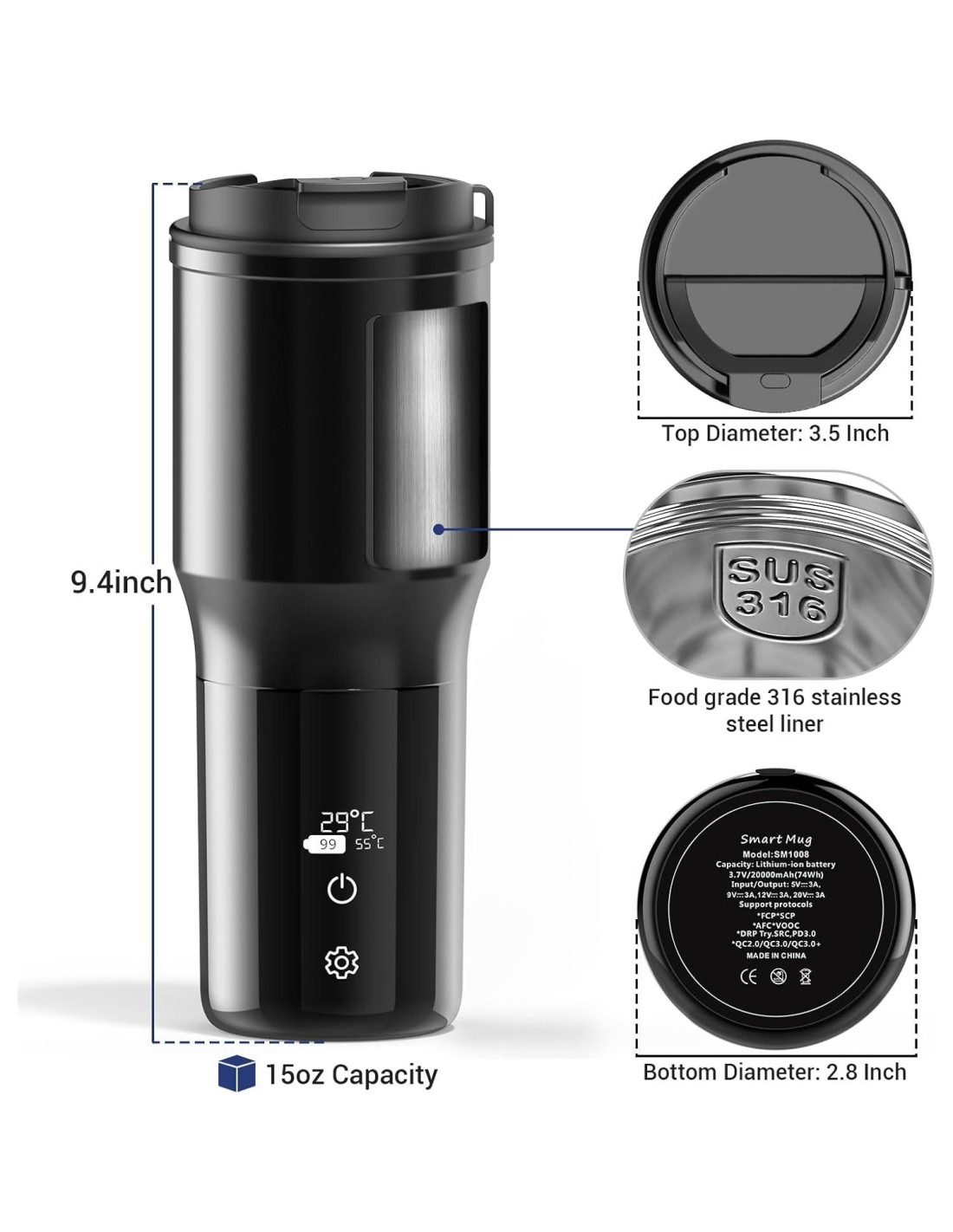 - [Taza de Café Auto-Calentada Premium] : Con su diseño moderno y elegante y control de temperatura de precisión, esta taza de café auto-calentada es el regalo perfecto para profesionales y viajeros, ofreciendo bebidas calientes durante todo el día en cualquier lugar - ya sea en la oficina, en la carretera o al aire libre.