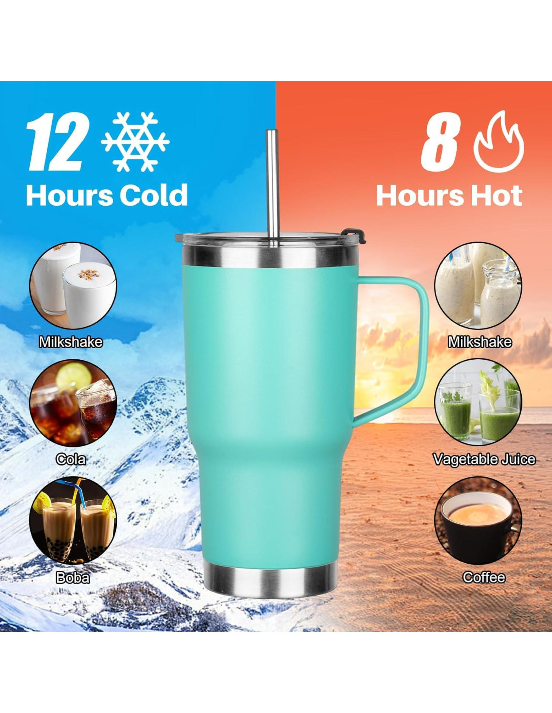 - La taza aislada de acero inoxidable de 20 oz con asa cuenta con doble aislamiento al vacío. ¡Puede mantener tus bebidas favoritas frías hasta por 12 horas y calientes hasta por 8 horas! Puedes servir café, té dulce, batidos, jugos, cócteles, agua helada, limonada, etc. en una taza de agua. ¡La taza de café con popote es apta para lavavajillas, liberando tus manos.