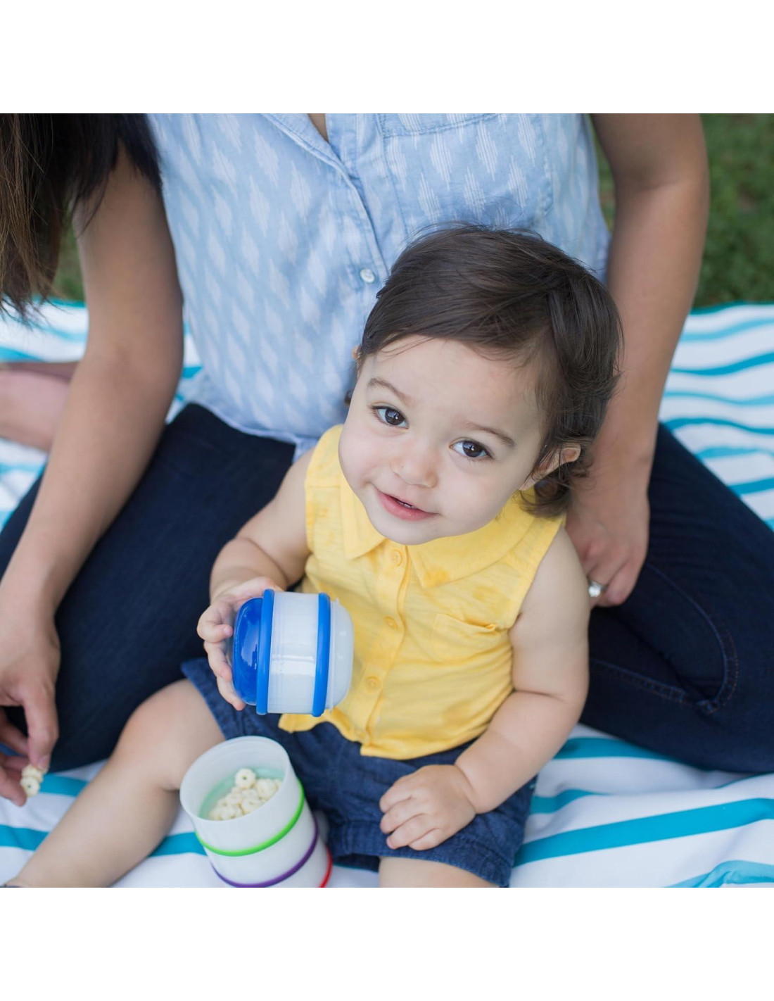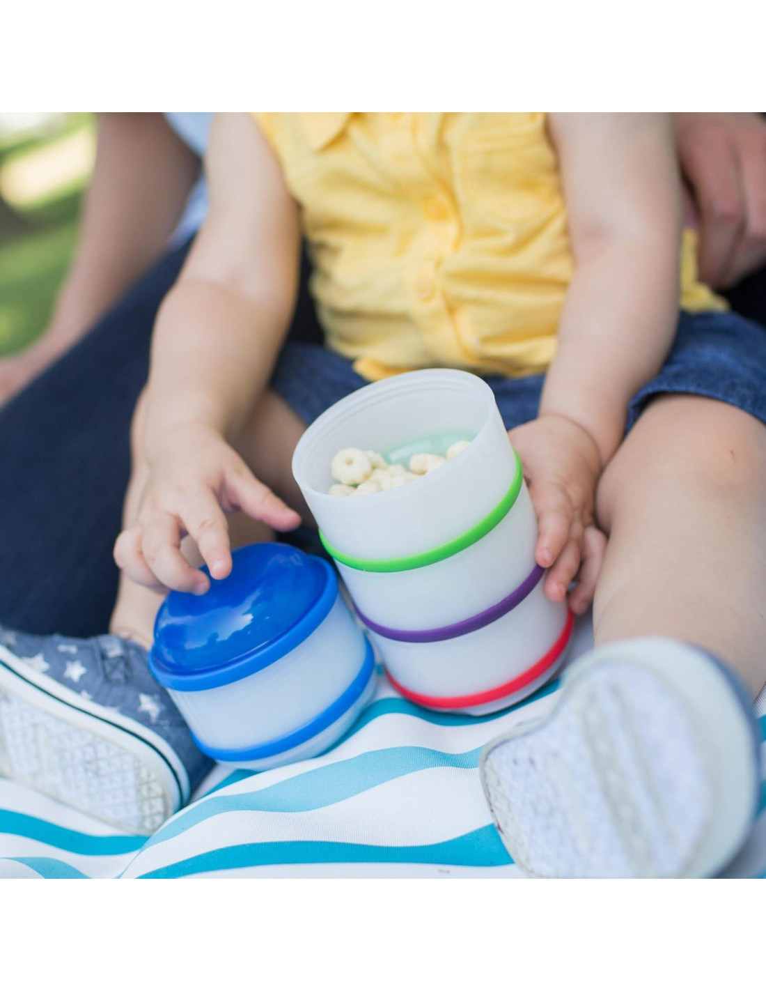 - Tazas apilables para bocadillos y salsas. 4 contenedores de bocadillos entrelazados te permiten almacenar y servir porciones perfectas de la comida del bebé, perfectas para cereales, frutas, verduras, yogur, fórmula en polvo y más.