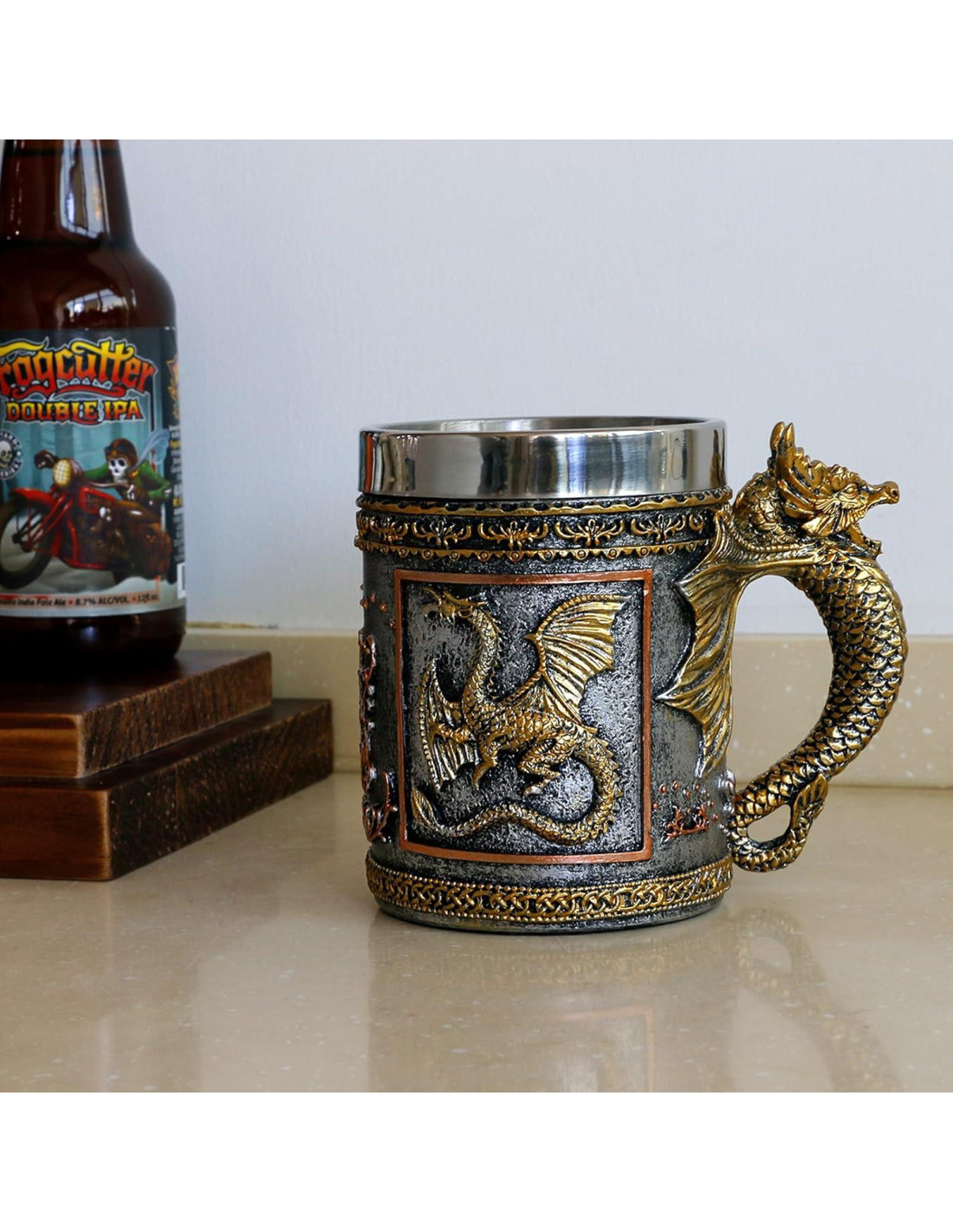 - Diseño de Novelties - Esta taza de dragón de estilo dorado vintage de dnd presenta un dragón gótico en relieve en ambos lados, rodeado de cadenas de hierro trenzadas celtas doradas de arriba a abajo, asegurando al dragón a la pared, el dragón ruge con rabia y extiende sus poderosas alas queriendo liberarse. Debes sostener valientemente el mango de este dragón y conquistarlo.