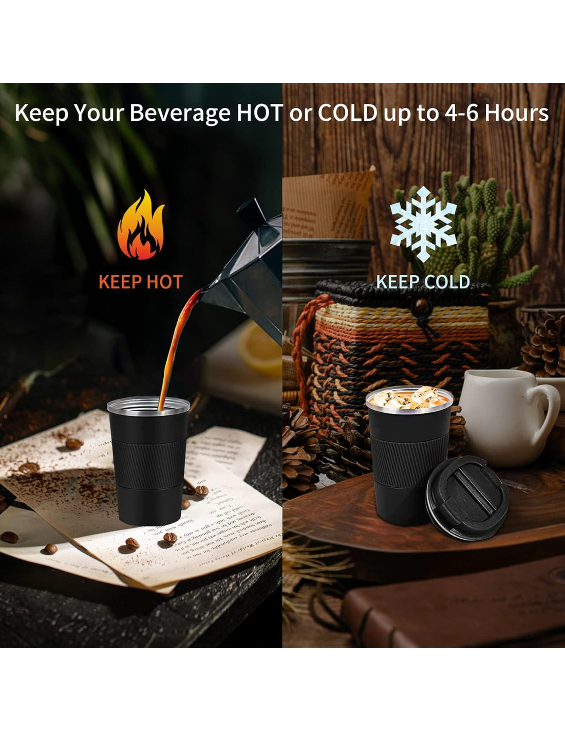- Mantén el Café Caliente o Frío por Horas: La taza de café de viaje está diseñada con aislamiento al vacío de doble pared que mantiene tu café, té o cualquier otra bebida caliente o fría a la temperatura perfecta por más tiempo. Mantiene tus bebidas calientes hasta por 8 horas y tus bebidas frías hasta por 6 horas, permitiéndote disfrutar de tu bebida favorita en cualquier momento del día.