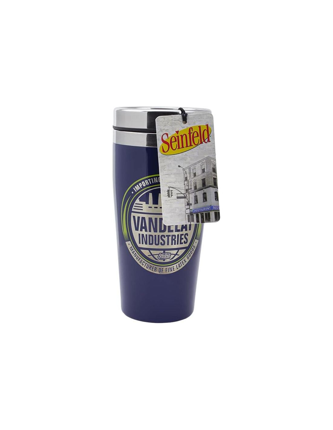 - Yada Yada: Finge hasta que lo logres con este termo de acero inoxidable azul marino de 450ml (15 fl oz) que presenta el logo de Vandelay Industries, la empresa de productos de látex falsa que George Costanza inventó en la famosa comedia.