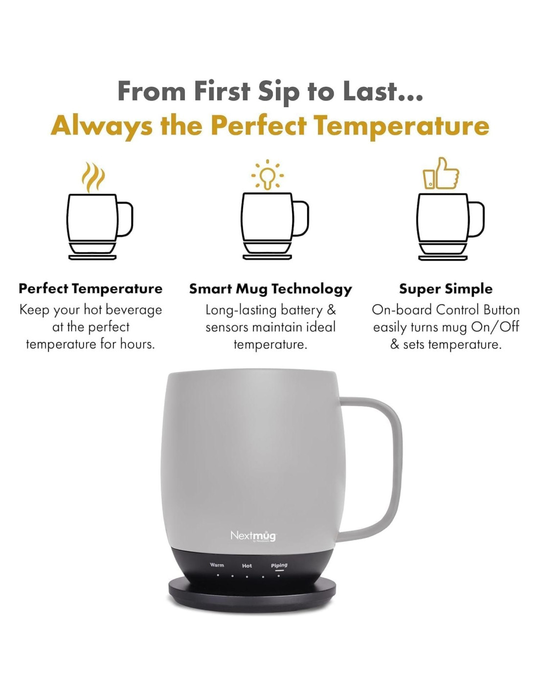 - SIEMPRE A LA TEMPERATURA PERFECTA - La Nextmug mantendrá tu café caliente, té o bebida preferida a la temperatura perfecta dondequiera que estés. Simplemente selecciona Caliente (54C), Muy Caliente (60C) o Hirviendo (65C) y disfruta durante horas.