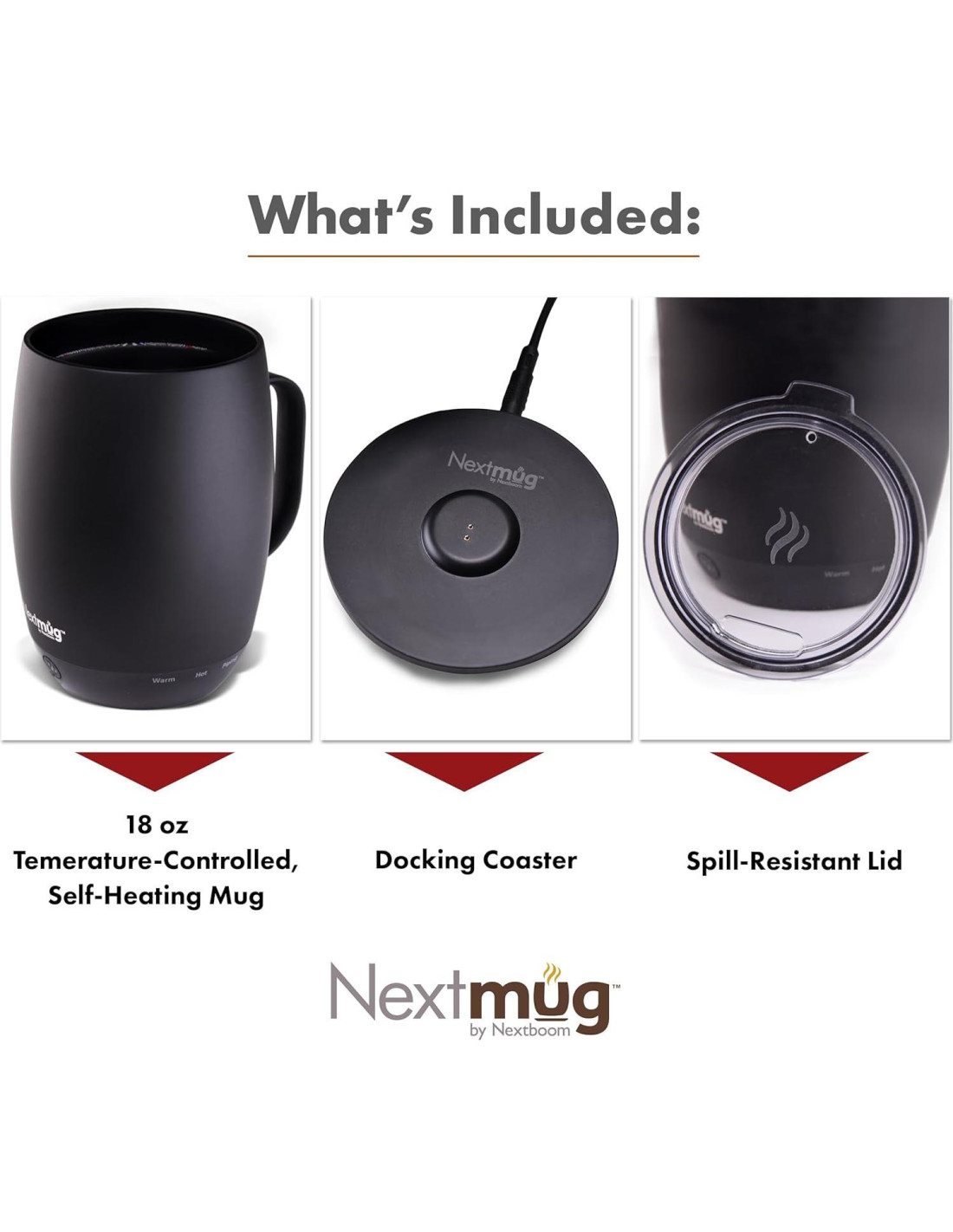 - QUÉ INCLUYE - (1) Nextmug Plus de 532 ml; (2) Posavasos de acoplamiento y cable de 1.83 metros para cargar la batería de iones de litio dentro de la Nextmug; (3) Tapa resistente a derrames para mantener los líquidos calientes en la taza y ayudar a mantener la temperatura ideal por más tiempo. Todas las Nextmugs son completamente compatibles, incluyendo tazas, tapas, posavasos de acoplamiento y accesorios.