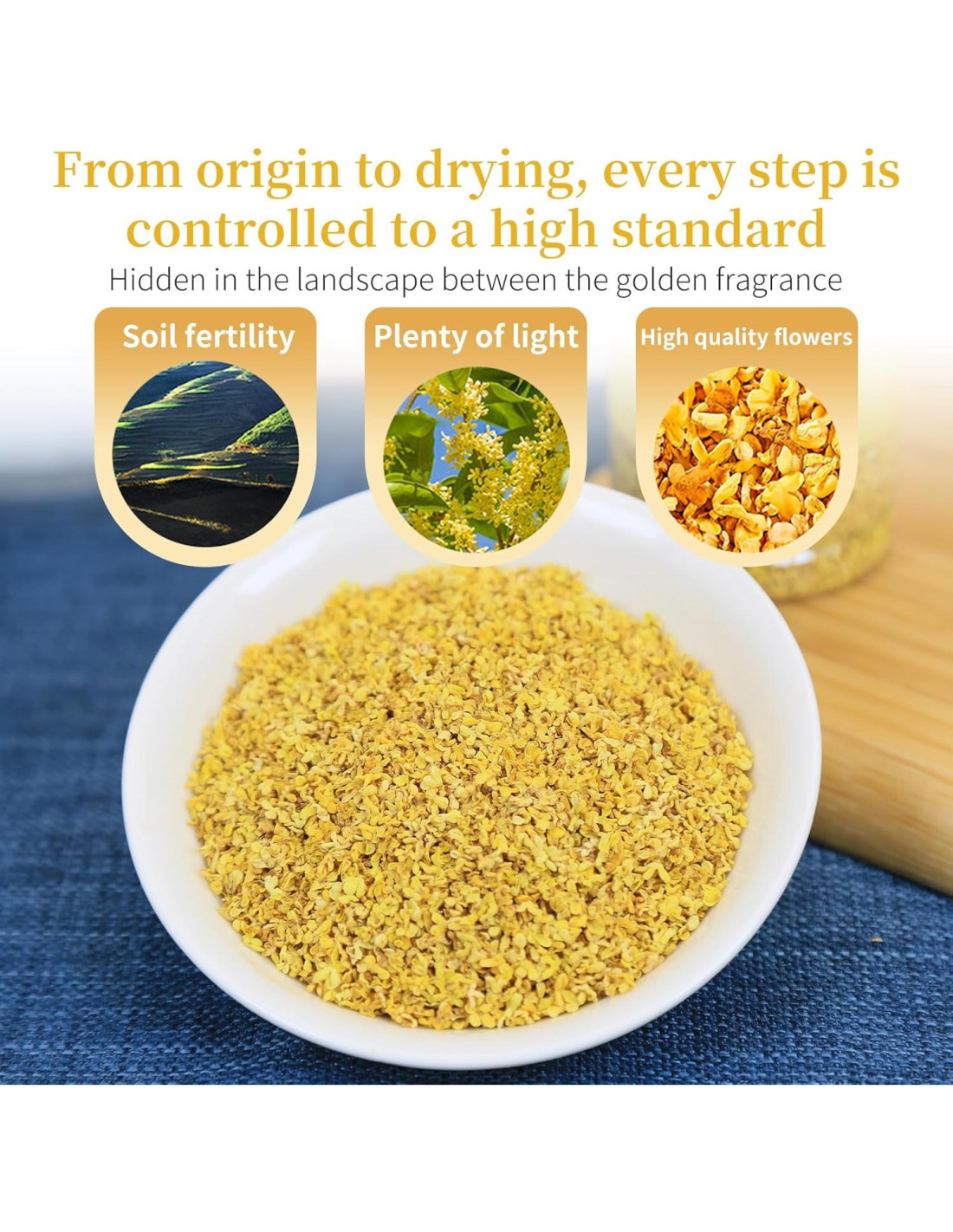 - ¿Natural sin adición?: Flores de osmanthus seleccionadas a mano, tamaño uniforme, pétalos completos, limpios y libres de impurezas. Nuestras flores de osmanthus secas son de color dorado, ricas en aroma, sin azufre, sin aditivos.