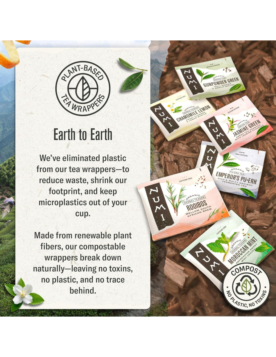 - Té en Bolsitas: Los tés orgánicos de calidad de hoja entera de Numi vienen en convenientes bolsitas de té para la preparación perfecta cada vez; Las bolsitas de té envueltas individualmente aseguran que tu té esté fresco, cada vez