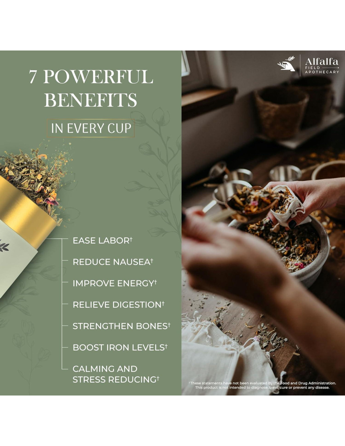 El Té de Embarazo de Alfalfa Field Apothecary es un té de hojas sueltas especialmente mezclado para proporcionar todos los mejores minerales y vitaminas que tú y tu bebé necesitan para un embarazo próspero, trabajo de parto y entrega, y posparto. Si se consume regularmente, se ha conocido que las hierbas en este té ayudan a construir niveles de hierro fuertes, apoyan la función cardiovascular saludable, refuerzan el sistema inmunológico, ayudan con las náuseas matutinas, apoyan la salud del hígado, tratan calambres y espasmos en las piernas y músculos, y acortan el tiempo y el dolor del trabajo de parto al tonificar el útero y hacer que funcione de manera eficiente. Nuestra misión es proporcionar a las madres y futuras madres los tés más nutritivos y deliciosos para apoyo durante su embarazo, trabajo de parto y entrega, y posparto. Seguro y efectivo para su uso durante los segundos y terceros trimestres del embarazo. Instrucciones: Vierte 240 ml de agua hirviendo sobre una cucharada de té y deja reposar durante cinco a diez minutos o déjalo en infusión durante la noche para una infusión fría. ¡Una bola de té funciona muy bien! Ingredientes: Hoja de Frambuesa Roja Orgánica, Hoja de Ortiga Orgánica, Hierbabuena Orgánica, Paja de Avena Orgánica, Alfalfa Orgánica, Caderas de Rosa Orgánicas, Raíz de Jengibre Orgánica, Cáscara de Naranja Orgánica.
