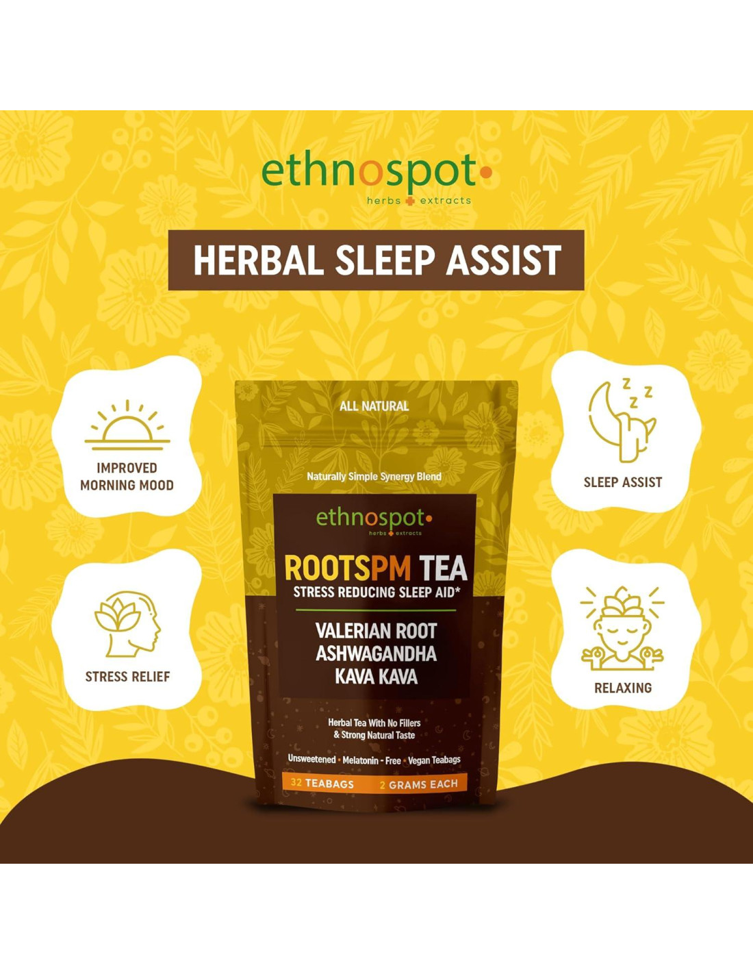 - Embalaje sostenible y conveniente: Cada bolsa de RootsPM Té para dormir contiene 32 bolsas de té, proporcionando un suministro completo de un mes de té herbal premium. Empacado en materiales reciclables y ecológicos, refleja un compromiso con la sostenibilidad. Cada bolsa de té de 2 gramos está diseñada para una fácil infusión, ofreciendo conveniencia sin comprometer la calidad o pureza.