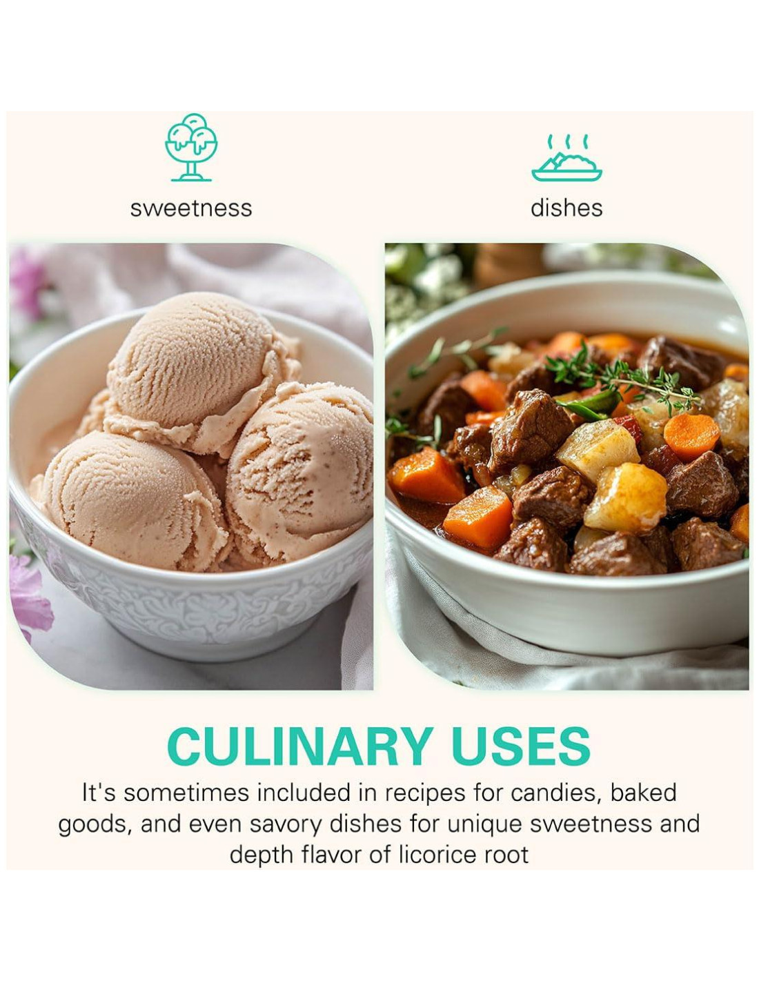 - [Sabor Dulce y Suave] La raíz de regaliz tiene un sabor notablemente dulce - mucho más dulce que el azúcar, ligeramente terroso y amargo. Su aroma es rico y distintivo, dulce, cálido y ligeramente leñoso