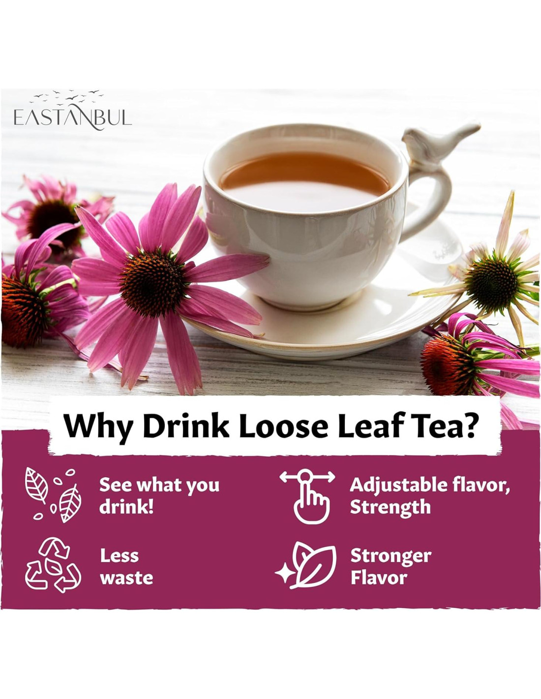 - Té de Echinacea en Hoja Suelta - Puro, Natural: Disfruta de los beneficios de la echinacea seca con nuestras flores y hojas de Echinacea Purpurea cuidadosamente seleccionadas. Esta hierba 100% natural y no OGM es perfecta para hacer un té de echinacea herbal fresco sin aditivos ni cafeína.