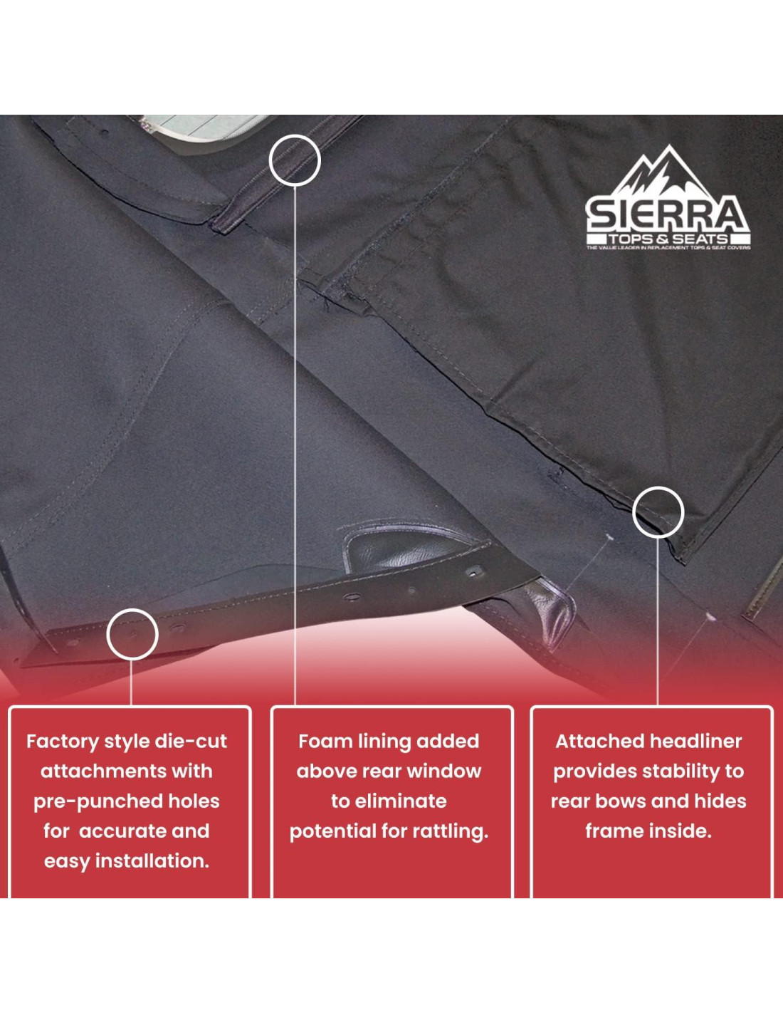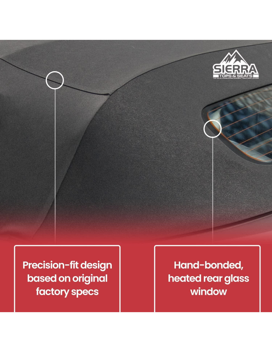 - CALIDAD DE FÁBRICA - En Sierra Auto Tops, nos enorgullecemos de ofrecer techos blandos convertibles de reemplazo de primera línea y premium que presentan nuestro diseño de ajuste de precisión Sierra. Cuando un techo blando de reemplazo tiene el sello de Sierra Auto Tops, sabes que está construido con especificaciones de calidad original de fábrica para asegurar un ajuste adecuado y una experiencia de alta calidad.