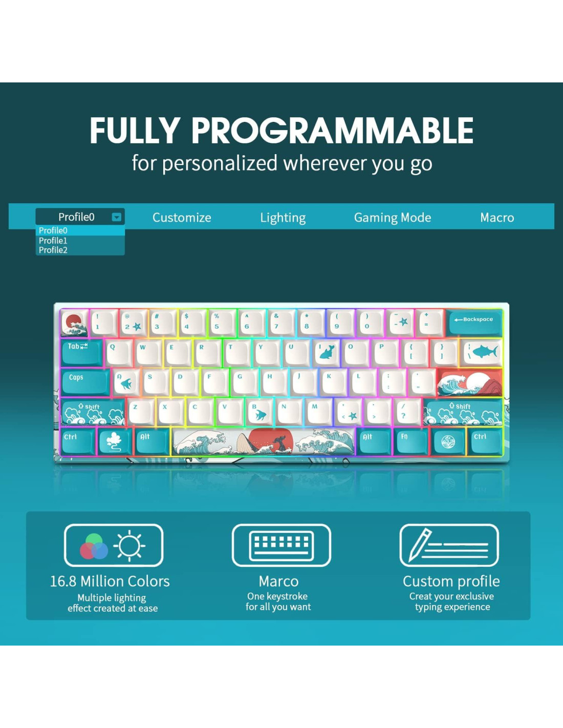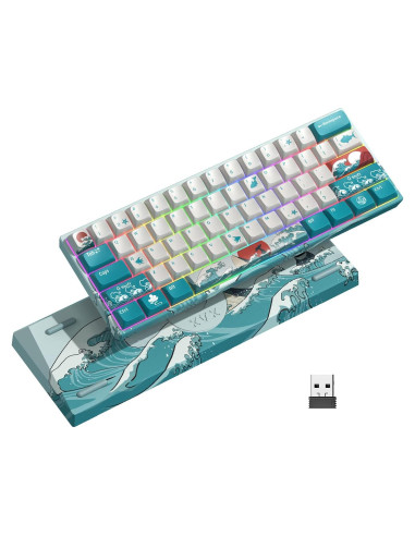 - [Teclado Ergonómico Gran Ola de Kanagawa] Este teclado de 60 por ciento tiene una única tecla de perfil Xvx PBT y carcasa temática, mostrando el patrón del mar coral en 360 grados, que tiene una excelente experiencia táctil y un largo tiempo de servicio. El diseño colorido puede traer un estado de ánimo más agradable a los juegos o al trabajo.