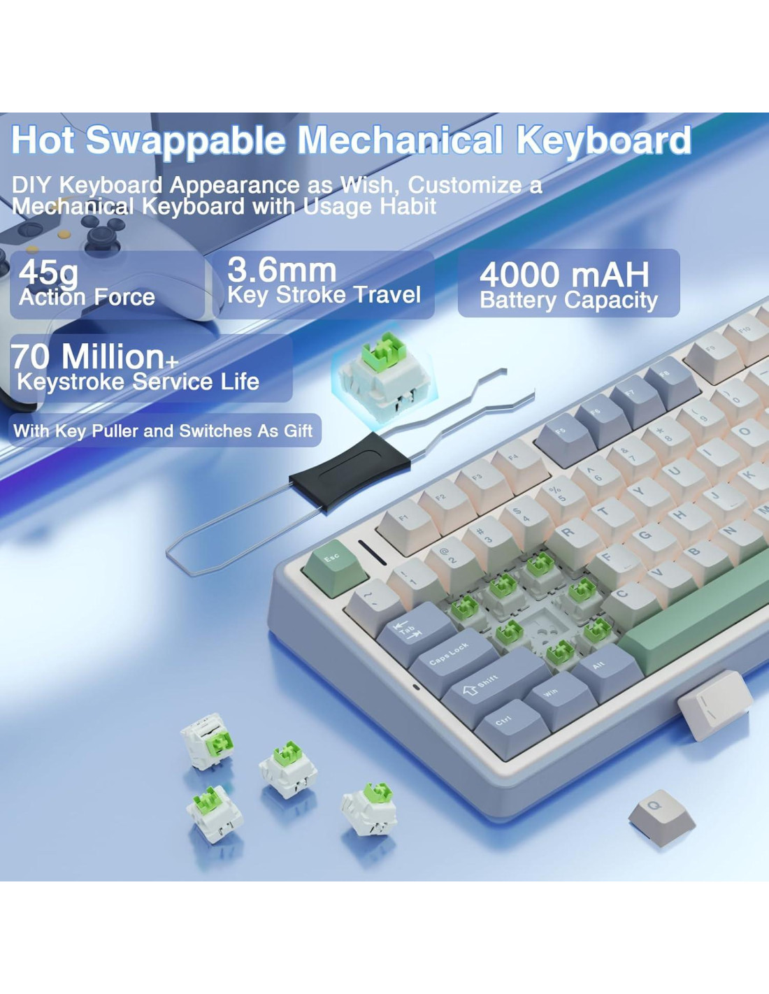 - Teclado de Conexión Trifásica: El teclado mecánico inalámbrico AULA F75 soporta BT5.0, conexión inalámbrica de 2.4GHz y conexión USB por cable, puede conectar hasta cinco dispositivos al mismo tiempo, y cambiar fácilmente mediante teclas de acceso rápido o botón lateral. El teclado F75 es adecuado para PC, laptops, tabletas, teléfonos móviles, PS, XBOX, etc., para satisfacer todas las necesidades de los usuarios. Además, el teclado recargable está equipado con una batería de gran capacidad de 4000mAh, que tiene una larga duración de batería.