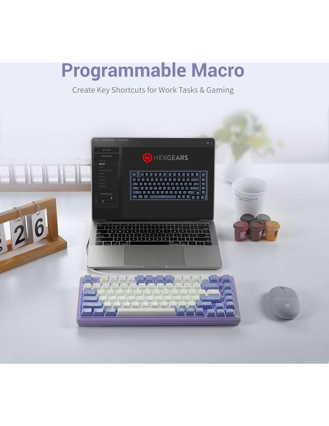 - [Configuración de Macros] Logra más con macros programables en el teclado mecánico crema Purple Rain M2. Te permite asignar secuencias de pulsaciones de teclas específicas y complejas para tareas repetitivas y optimizadas. Mientras que la retroiluminación blanca proporciona una atmósfera minimalista que se adapta a tu estado de ánimo.