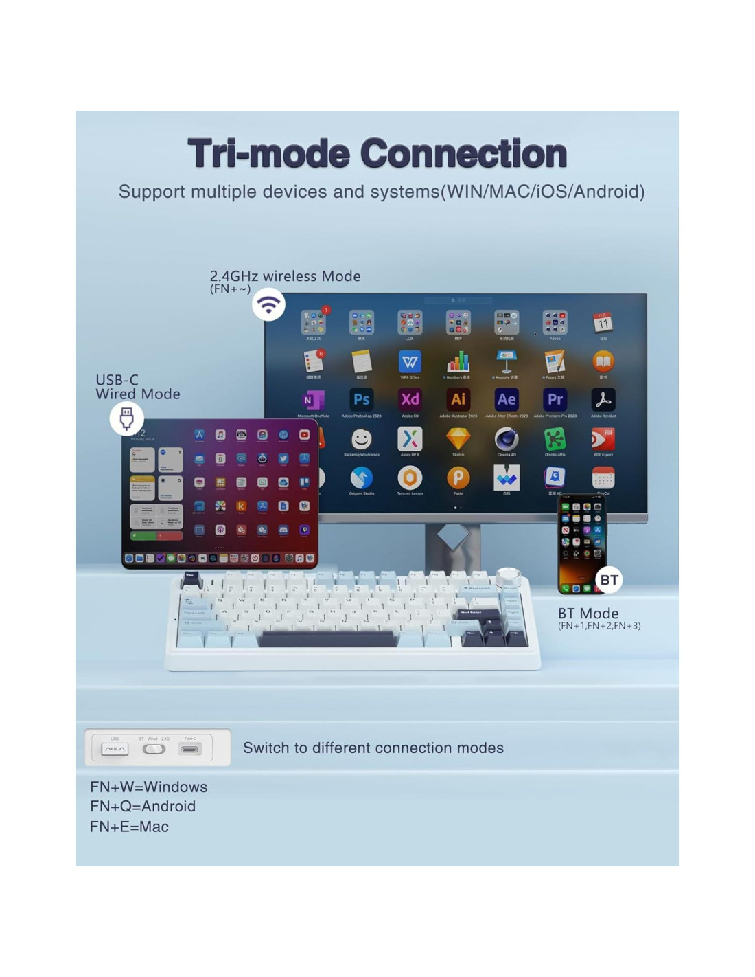 - Teclado de Conexión Trifásica: El teclado mecánico inalámbrico AULA F75 soporta BT5.0, conexión inalámbrica de 2.4GHz y conexión USB por cable, puede conectar hasta cinco dispositivos al mismo tiempo, y cambiar fácilmente mediante teclas de acceso rápido o botón lateral. El teclado F75 es adecuado para PC, laptops, tabletas, teléfonos móviles, PS, XBOX, etc., para satisfacer todas las necesidades de los usuarios. Además, el teclado recargable está equipado con una batería de gran capacidad de 4000mAh, que tiene una larga duración de batería.