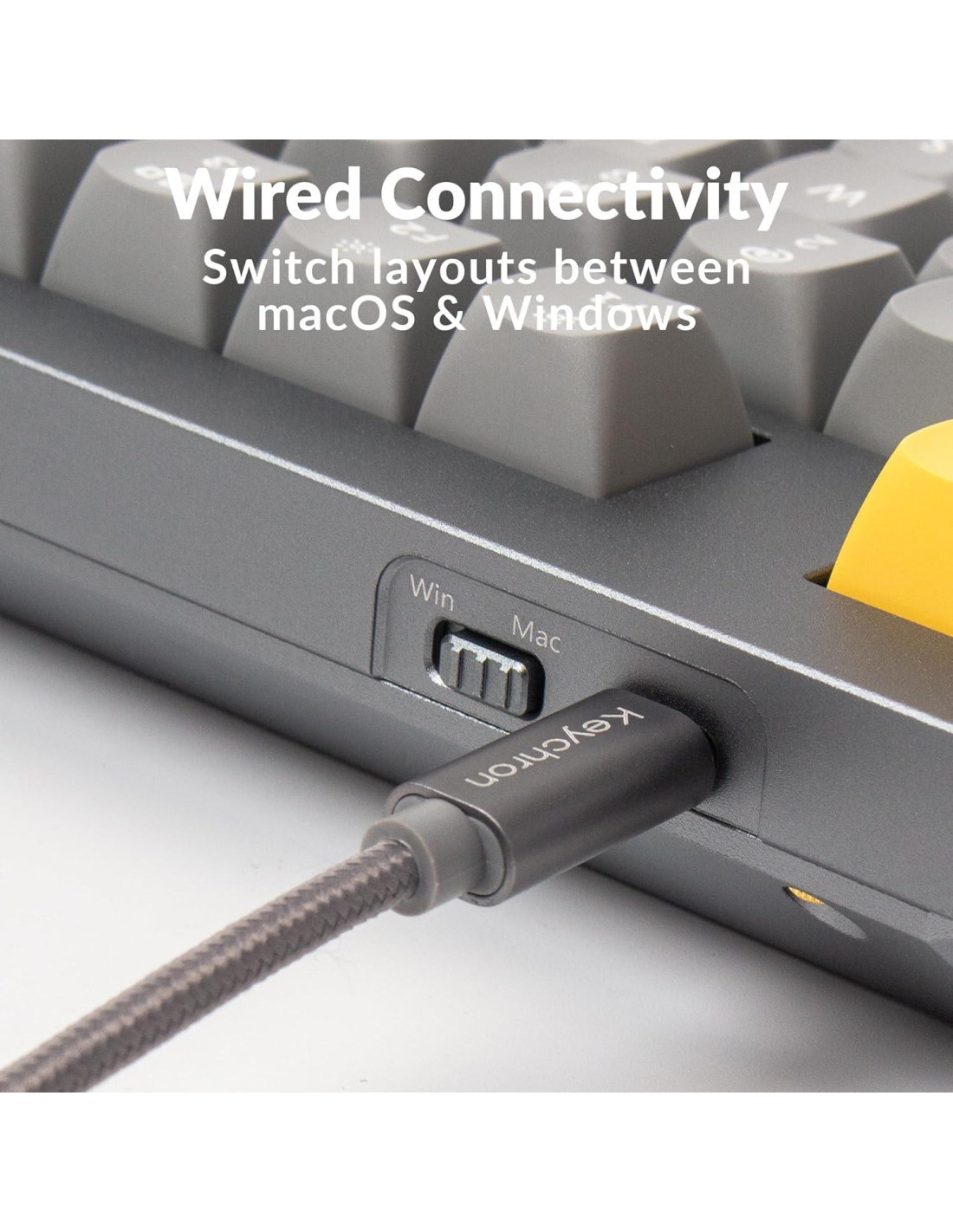 Conectividad por Cable Una conexión USB Tipo-C por cable confiable con una tasa de sondeo de 1000 Hz y NKRO aseguran que no te pierdas de nada, ya sea escribiendo correos electrónicos o código. Nota: Por favor, evita conectar la laptop a través de un hub para asegurar un suministro de energía suficiente. Por la misma razón, por favor apaga la retroiluminación del teclado si está conectado a una tableta.