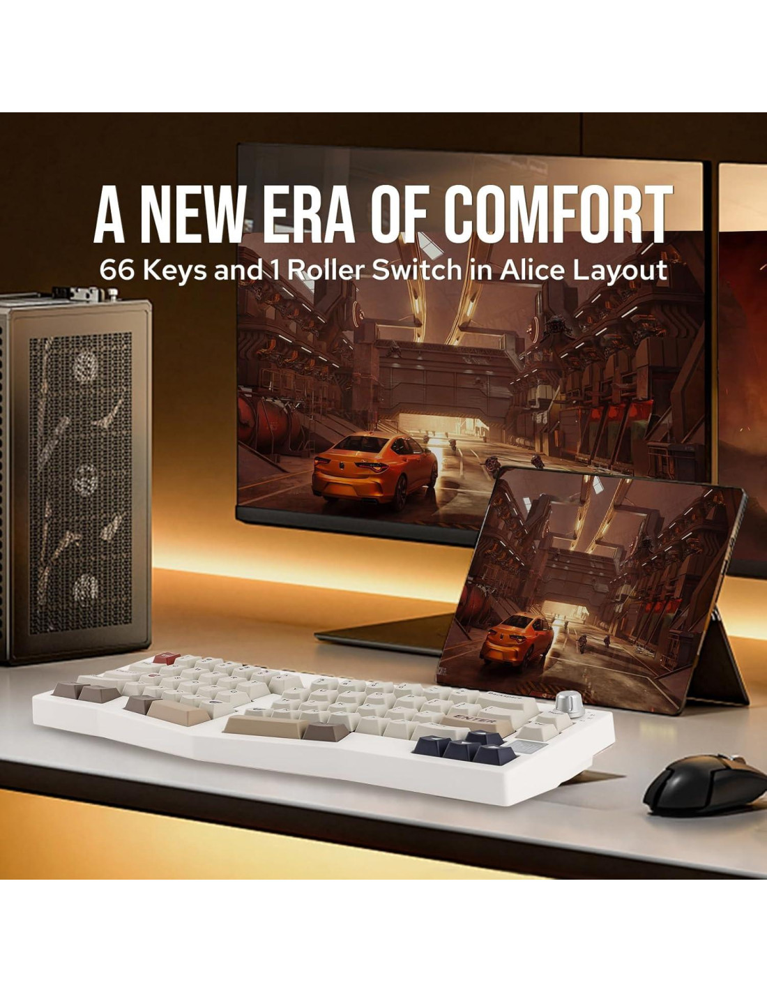 - Diseño Ergo Alice con 66 Teclas: Adéntrate en una nueva era de comodidad con el teclado Epomaker Alice 66, que cuenta con un diseño ergonómico Alice con 66 teclas. Este diseño cuidadosamente elaborado apoya el movimiento y posicionamiento natural de las manos, reduciendo significativamente la tensión en la muñeca durante largas sesiones de escritura. Ideal para entusiastas y profesionales por igual, este teclado ergonómico está repleto de funcionalidad para una experiencia de escritura más fluida.
