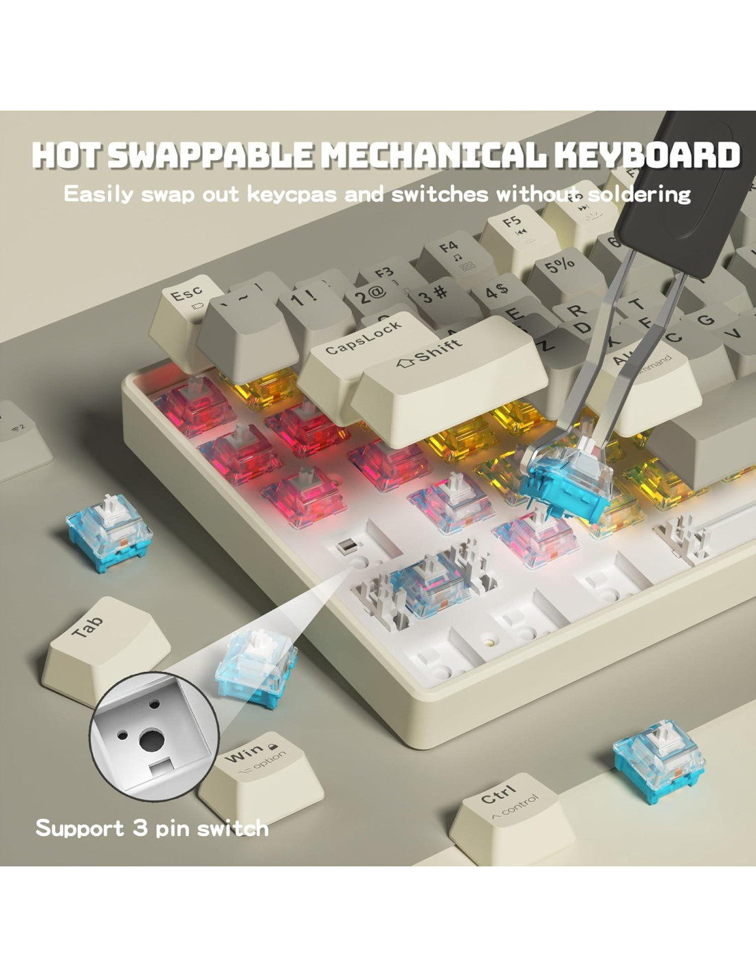 - Personalización Intercambiable: Los sockets de intercambio caliente de 3/5 pines de estándar industrial permiten un reemplazo de interruptores sin esfuerzo sin soldadura. Incluye extractor de interruptores + 2 interruptores extra para comenzar tu viaje de personalización mecánica.