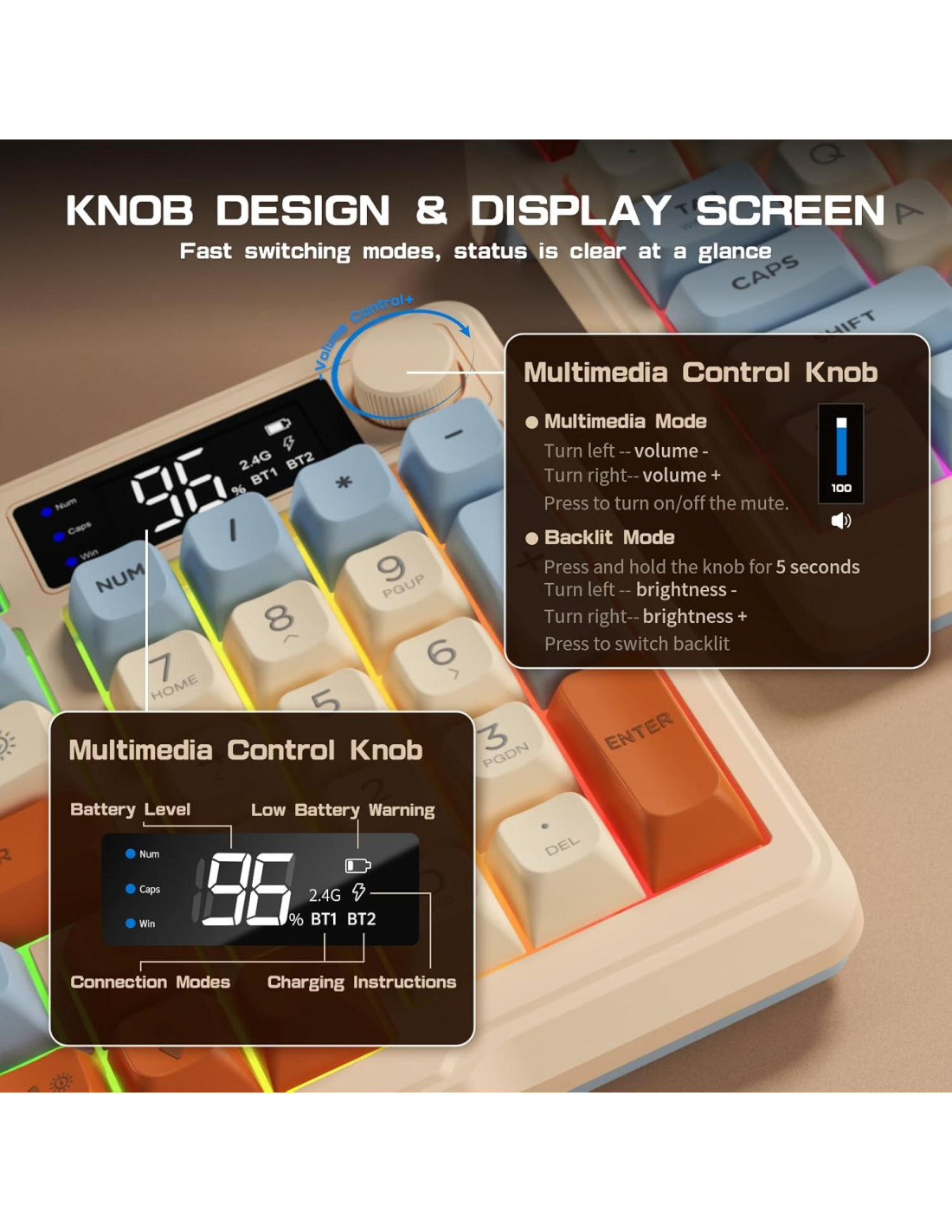 - [Conexión dual modo 2.4G/Bluetooth] La conexión dual modo 2.4G y Bluetooth inalámbrico hace que este teclado sea extremadamente estable y duradero, con operación estable y no es fácil de desconectar. Este teclado viene con una pantalla electrónica LED, batería incorporada de 2000Ah, ultra larga duración de la batería, visualización en tiempo real del nivel de batería y estado de conexión, facilitando el dominio de la operación.