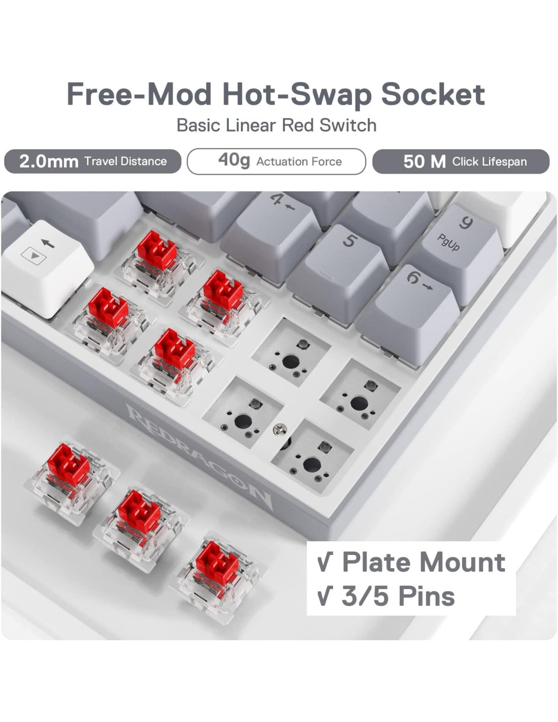 - ¡SÍ! VERDADERO INTERCAMBIO EN CALIENTE - La innovación transformadora con más del 99.8% de compatibilidad de interruptores, el teclado Redragon intercambiable en caliente está disponible ahora. El diseño exclusivo y único de la estructura del socket hace que la instalación del interruptor sea más fácil y con menos movimiento.