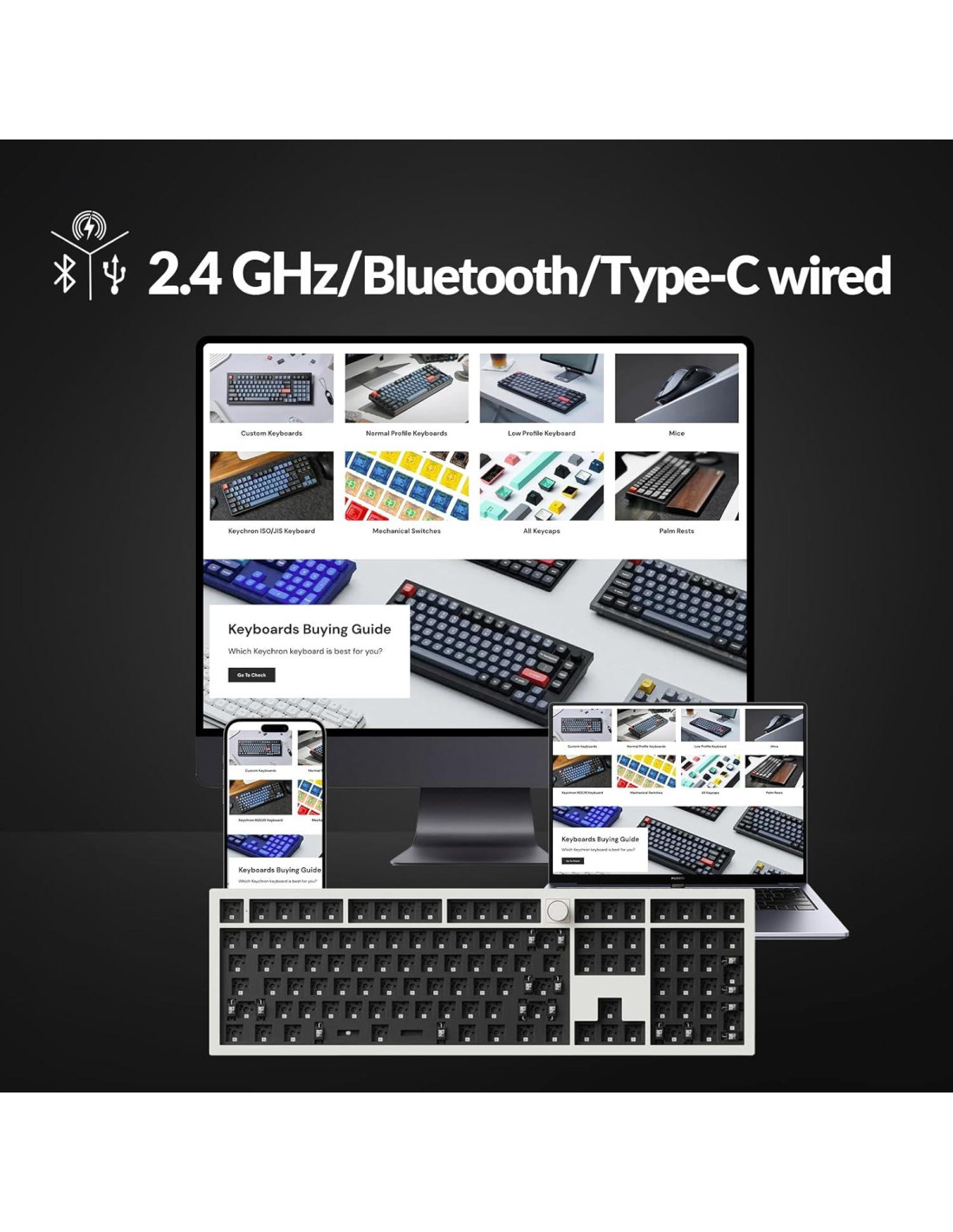 - Keychron Q6 Max Versión Barebone con Perilla - Un teclado mecánico inalámbrico personalizado. Presenta un cuerpo de metal completo, conexión inalámbrica de 2.4 GHz y Bluetooth, reasignación de teclas QMK/VIA, tasa de sondeo de 1000 Hz, diseño de doble junta, estabilizadores atornillados y más características premium.