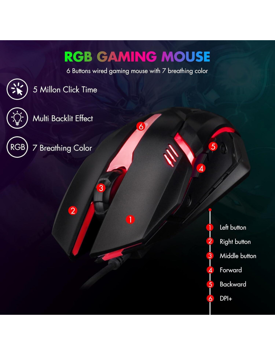 - Ratón Gaming por Cable----El ratón gaming por cable USB tiene un sensor de alta precisión y pies de PTFE de baja fricción para darte un control preciso y suave. Cuatro niveles de DPI (puntos por pulgada) se pueden cambiar fácilmente (800/1600/2400/3200). 6 botones (2 botones laterales). Mantén presionado el botón DPI para cambiar entre respiración de 7 colores/luz roja. Tamaño del ratón gaming: 5.23*2.75*1.57 inches (13,29*6,99*3,99 cm)