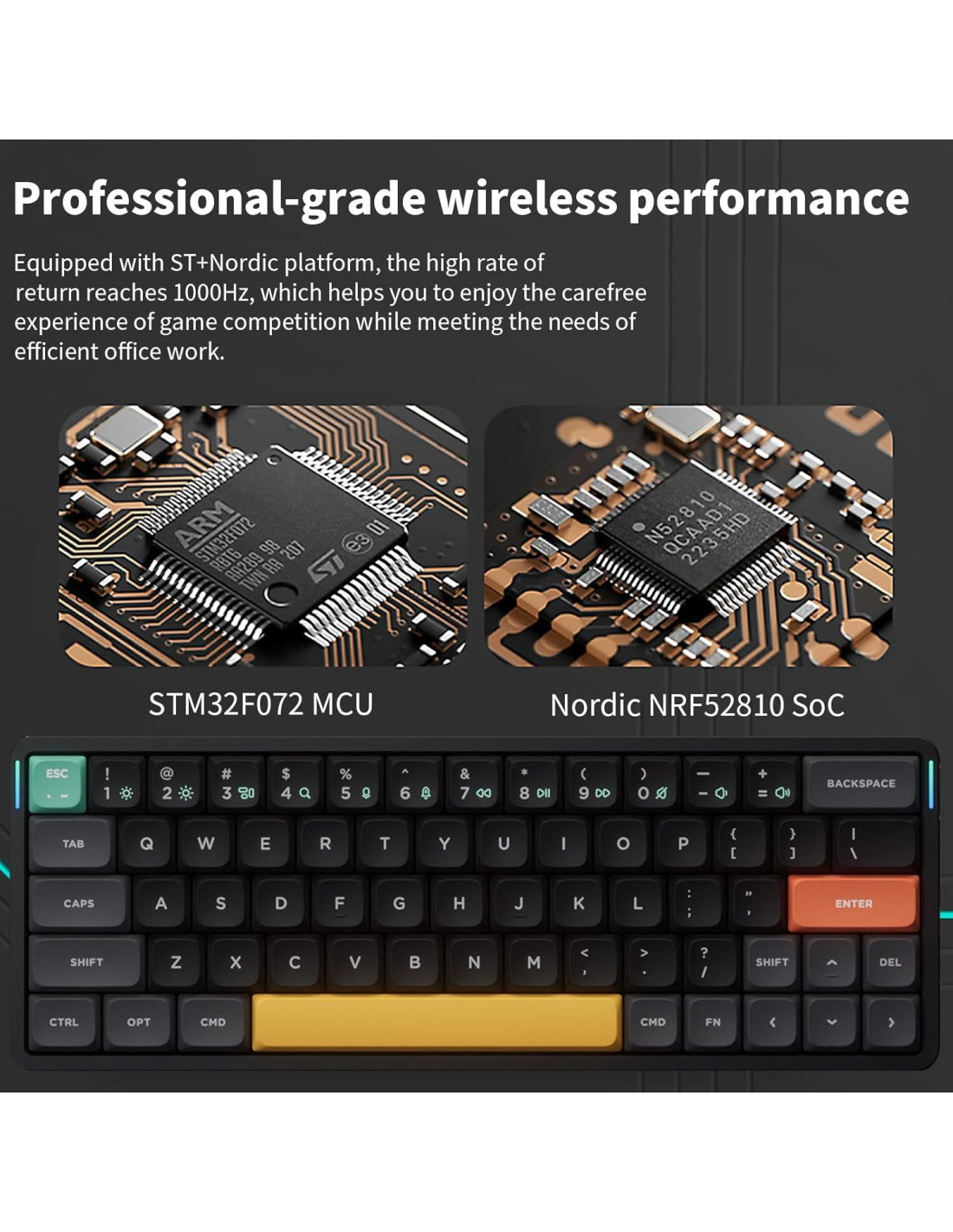 - Tasa de retorno de 1000Hz La tasa de retorno del teclado mecánico inalámbrico Air60 V2 en modo inalámbrico alcanza 1000Hz, lo que te permite disfrutar de menor retraso en el juego incluso en modo inalámbrico. No más limitado a la oficina, sino que también puede brindarte una mejor experiencia de juego.