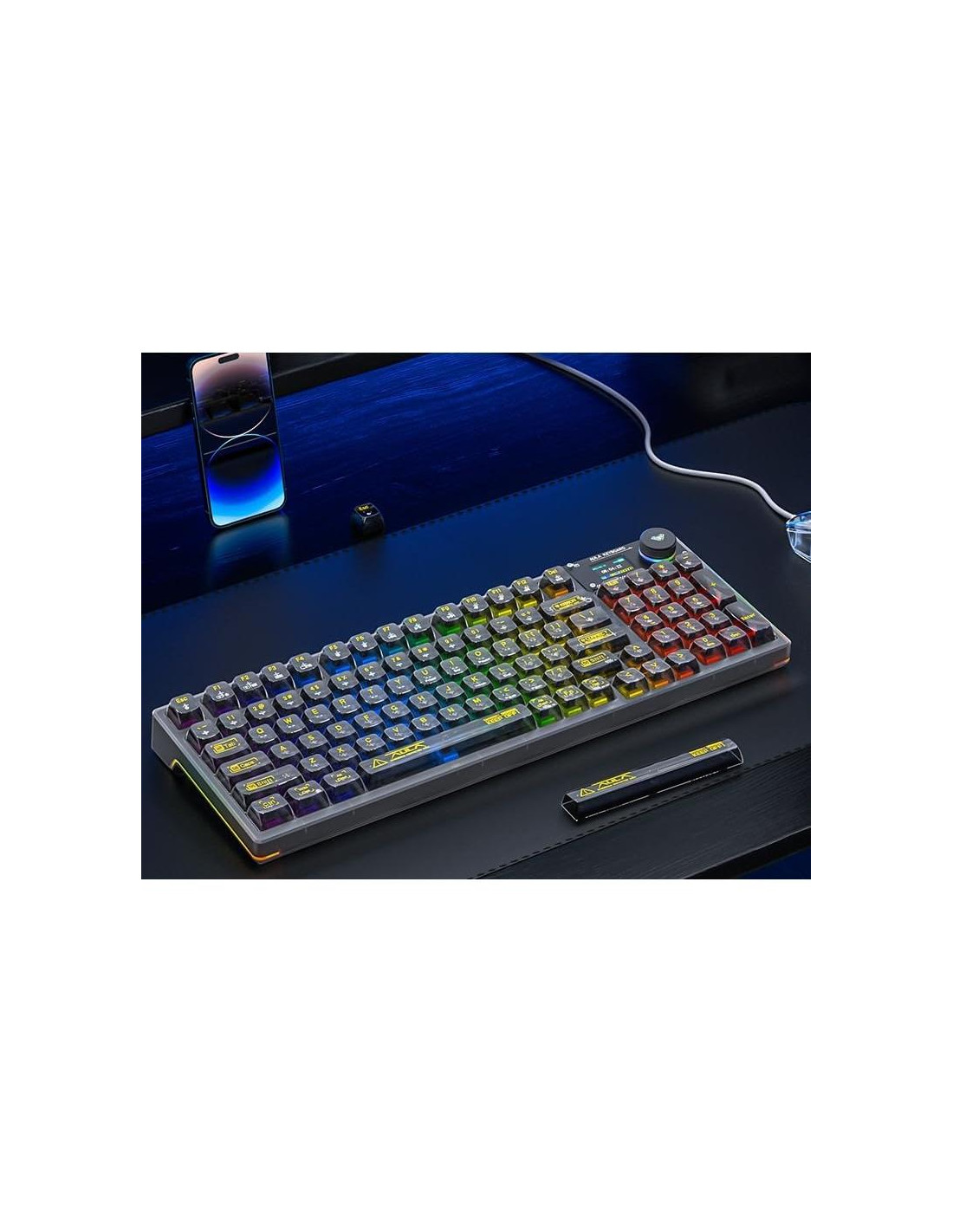 - [Teclado transparente con pantalla inteligente OLED] La carcasa de la pantalla OLED está protegida por una aleación de aluminio, añadiendo un toque mecánico a este elegante teclado. La pantalla OLED cambia entre pantallas de visualización al girar una perilla. Se divide principalmente en una página principal, una página GIF y una página de configuración de funciones. En la página de configuración de funciones, el usuario puede ajustar el modo de conexión del teclado, el cambio de sistema, el modo de retroiluminación, el color, el brillo, la velocidad, el control de volumen y la selección de idioma con la perilla. También puedes personalizar y dibujar tus propias imágenes y GIFs utilizando software compatible con WIN (el software de controlador no está disponible para sistemas mac).