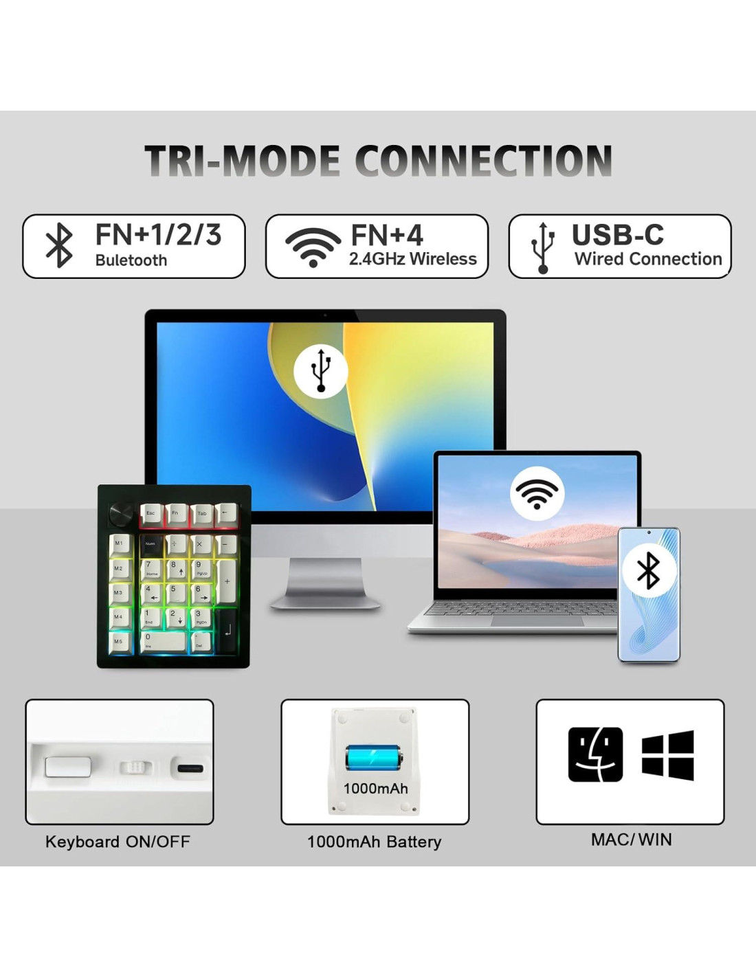 - CONECTIVIDAD EN TRES MODOS Y BATERÍA DE 2000MAH -- Este teclado numérico inalámbrico soporta conexión triple modos: Bluetooth 5.0/2.4GHz/cable tipo C. Bluetooth reduce efectivamente el consumo de energía, presiona FN+1/2/3 para cambiar entre tres dispositivos, y el cable USB-C desmontable se puede recargar mientras está en uso. El teclado recargable también cuenta con una batería de gran capacidad de 2000mAh que asegura largas horas de uso.