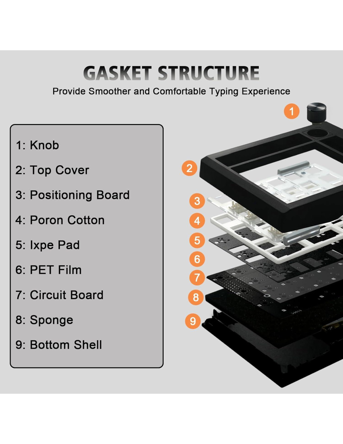 - MONTURA GASKET Y INTERRUPTORES LINEALES INTERCAMBIABLES EN CALIENTE -- Presenta una estructura de gasket que, combinada con la capa inferior de esponja, la espuma sándwich y la almohadilla de interruptor IXPE, proporciona una experiencia de escritura acolchada que reduce la tensión en tus dedos y minimiza el ruido. Este teclado numpad personalizado con base intercambiable en caliente soporta reemplazo de interruptores de 3 pines o 5 pines. Incluso los principiantes en teclados pueden fácilmente personalizar sus propios teclados sin problemas de soldadura.
