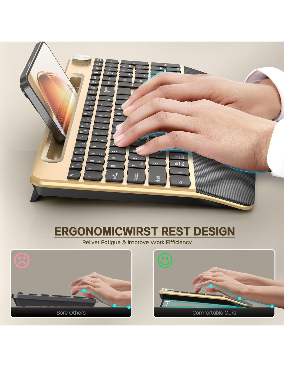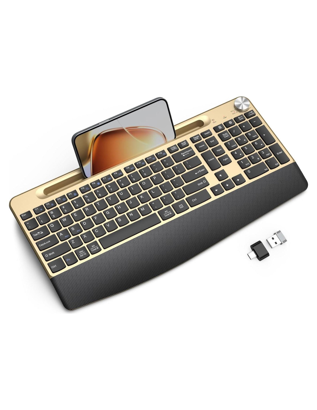 - Diseño Ergonómico con Reposamuñecas Teclado dorado diseñado con un generoso reposamuñecas y patas inclinadas, ofrece una mejor posición de escritura para reducir la presión en tu muñeca. El teclado inalámbrico dorado USB tiene un tacto y sensación de escritura cómodos, cada detalle está cuidadosamente diseñado para adaptarse completamente a tu mano. (Recordatorio Especial: Este producto es un teclado inalámbrico USB, y no incluye ratón. Por favor, ten en cuenta.)