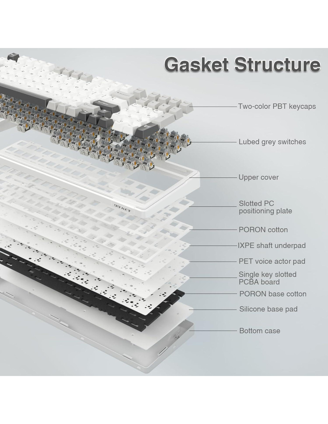 - Estructura de Gasket y Ranurado de Tecla Única en PCB: Este teclado de computadora presenta una estructura de gasket, almohadilla de silicona integrada extendida y ranurado de tecla única en PCB, optimiza mejor la resiliencia y estabilidad, haciendo que la sensación al tacto sea más suave y elástica. Cinco capas de relleno silenciador llenan el espacio entre el PCB, la placa de posicionamiento y el eje, contrarrestando efectivamente el sonido de ruido de cavidad del eje golpeando la placa de posicionamiento, y proporcionando una sensación sólida