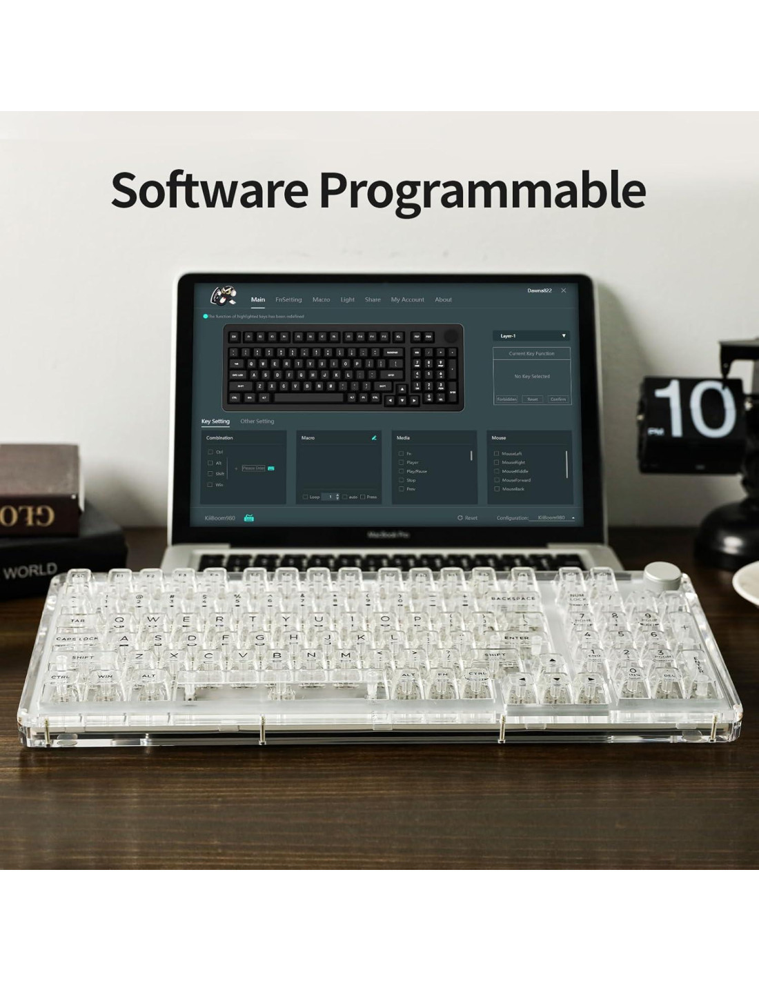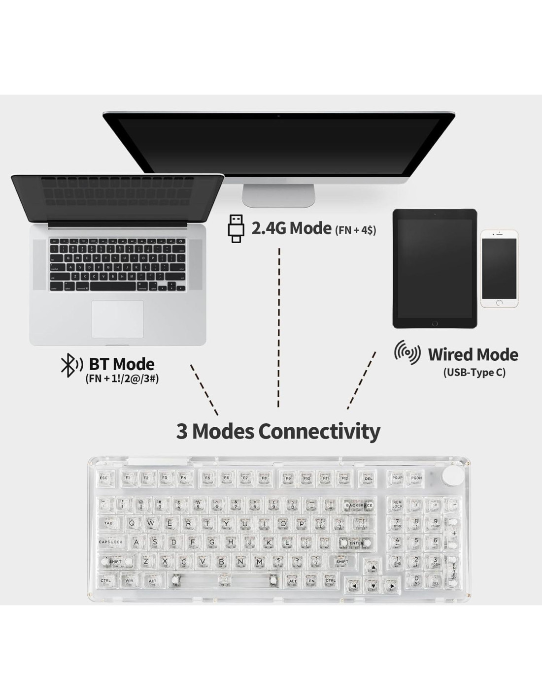 - [Conectividad Mejorada y Durabilidad Refinada] El KiiBOOM Phantom 98 ofrece opciones de conectividad inigualables para adaptarse a cualquier configuración. Con Bluetooth para emparejamiento inalámbrico sin problemas, USB Tipo-C para una conexión por cable rápida y confiable, y la versatilidad añadida de la tecnología inalámbrica de 2.4G, puedes cambiar entre dispositivos con facilidad y eficiencia. La construcción de acrílico del teclado no es solo para mostrar, su durabilidad es evidente en su resistencia al desgaste, lo que lo convierte en una opción confiable para todos.