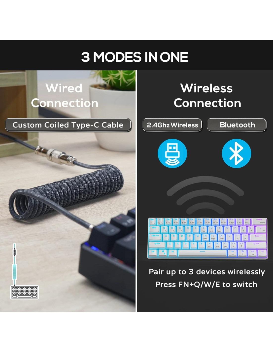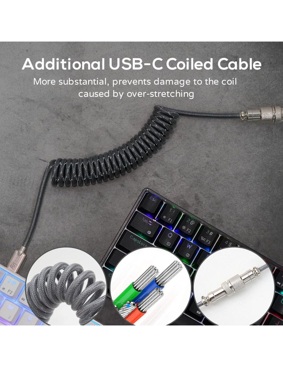 - Diseño Compacto de 61 Teclas Sin teclas numéricas adicionales, puede satisfacer tus demandas en la oficina o en casa. El Teclado Mecánico Mini 60% ahorra espacio y es portátil. Equipado con un cable de teclado enrollado gris de 1.4 m. Cable USB C personalizado de doble funda para teclado mecánico gaming. Teclas compactas de 61 con conectores de metal trenzados, dedicados para jugadores de FPS y trabajo eficiente.
