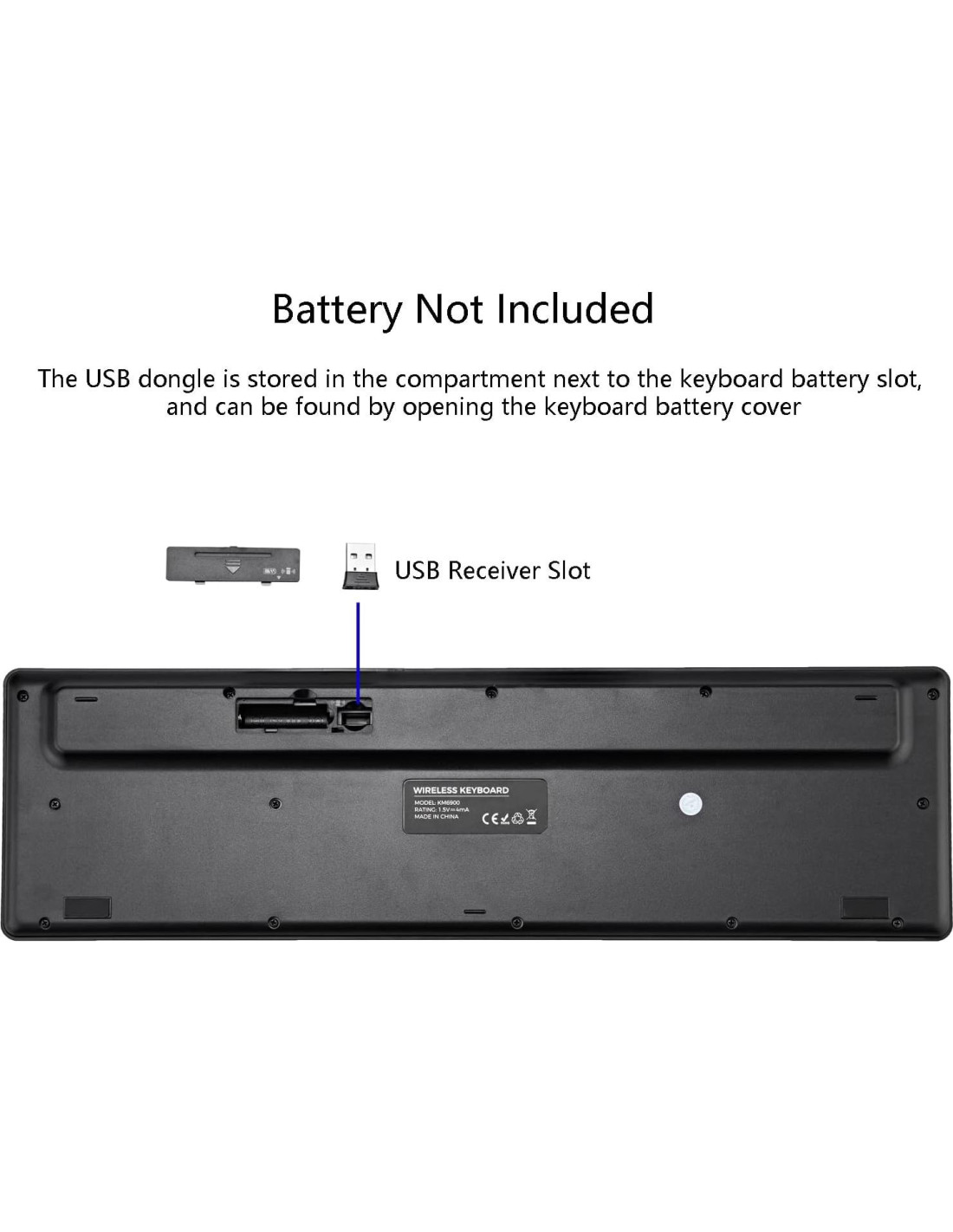 El dongle USB se almacena en el compartimento de la batería del teclado y se puede encontrar abriendo la tapa de la batería del teclado. Cómo usar el teclado: Saque el receptor USB, insértelo en el puerto USB de la PC o laptop, luego coloque 1 batería AAA en el teclado, espere unos segundos, puede comenzar a usarlo. Nota: 1. Las baterías no están incluidas. 2. El receptor Nano se almacena en el compartimento junto a la ranura de la batería del teclado y se puede encontrar abriendo la tapa de la batería del teclado. Especificaciones del producto: Tamaño del teclado: 42.9 * 12.6 * 2.3 cm Peso del teclado: 423 g Distancia de operación: 10 m Paquete: 1 * Teclado Inalámbrico 1 * Receptor USB 1 * Manual del Usuario Soporte de Servicio: Le proporcionamos 12 meses de garantía y servicio de contacto por correo electrónico las 24 horas. Si tiene alguna pregunta o necesidad, no dude en contactarnos. Nuestro objetivo es brindarle el servicio al cliente más satisfactorio.