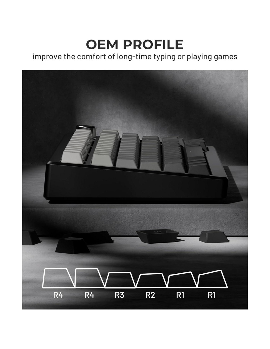 - [Teclas Ergonomicas de Perfil OEM] La tecla de perfil OEM utiliza un diseño de altura escalonada, que se ajusta a la curvatura natural del dedo, haciéndola más cómoda para escribir durante mucho tiempo y reduciendo la fatiga. Por eso sigue siendo popular hasta ahora.