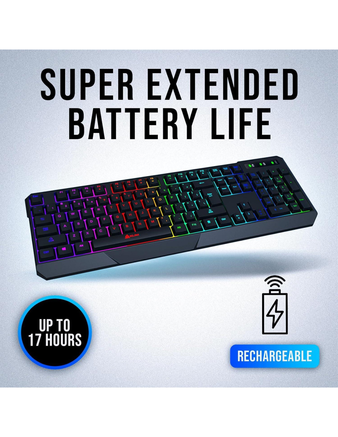 - BATERÍA DE LARGA DURACIÓN. ¡No es necesario comprar más baterías! El teclado gaming viene con baterías recargables de calidad premium incorporadas. Gastarás menos dinero mientras ayudas al medio ambiente. Es simplemente una inversión inteligente.