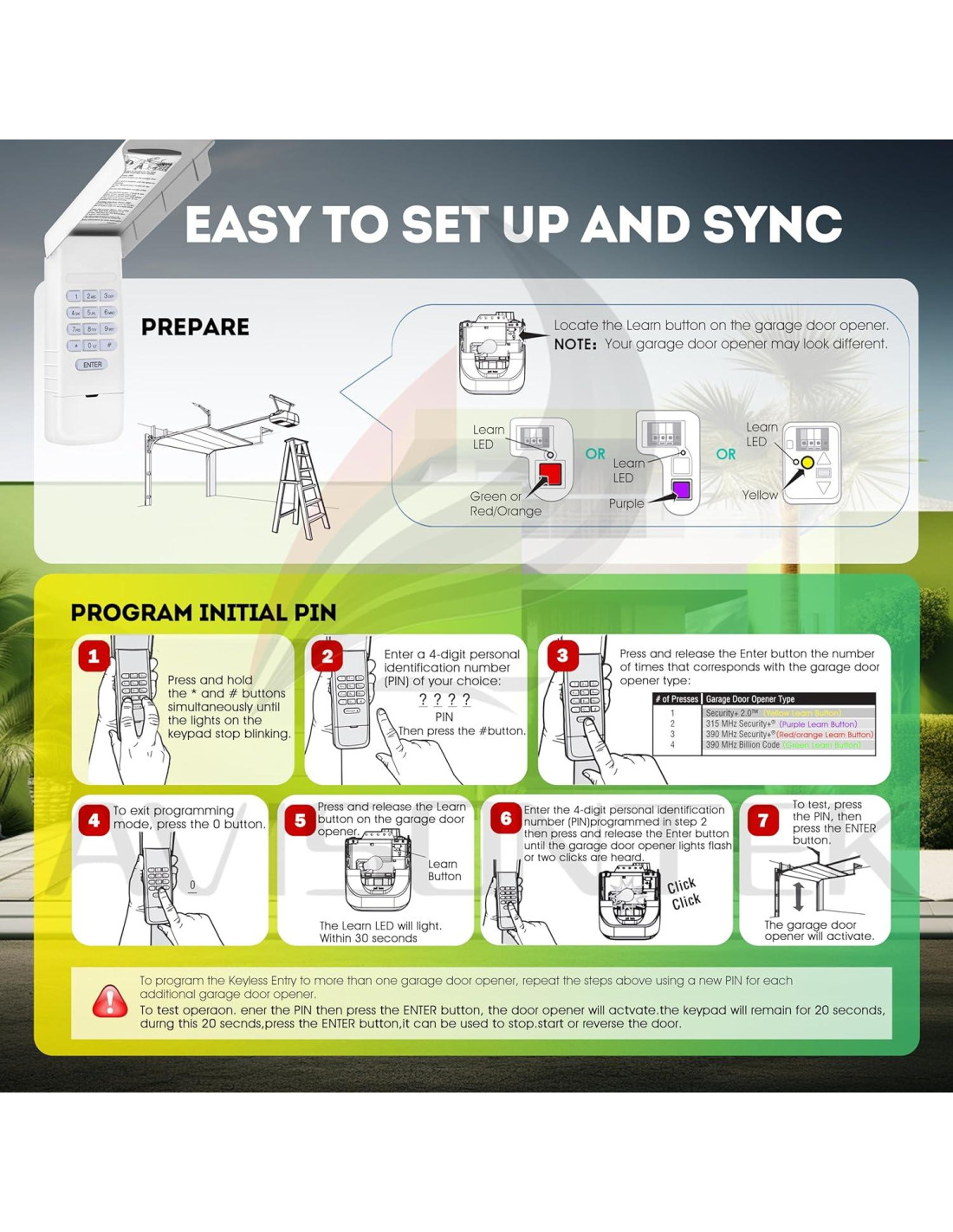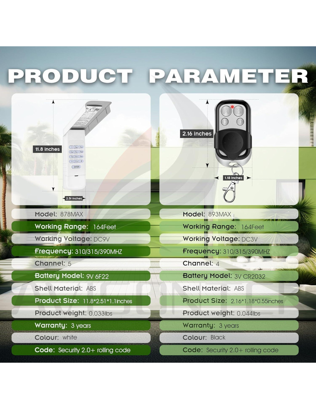 - **Amplia Compatibilidad**: Compatible con LiftMaster Chamberlain Sears Craftsman Abridores de Puertas de Garaje desde 1993 hasta el presente con un botón de aprendizaje de color púrpura/amarillo/rojo/naranja/verde. Reemplazo para 877MAX/878MAX/877LM/377LM/977LM/66LM [No soporta abridores de interruptor DIP]