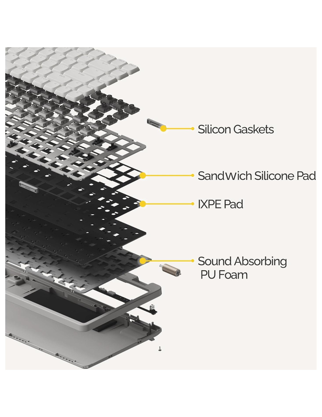 - Diseño de Junta para Brindar Suavidad y Amortiguación: Diseñado para acomodar tanto switches de 50gf como de 40gf, ofrece la flexibilidad para adaptarse a tu estilo de escritura único. También hemos mejorado la capa de amortiguación de sonido del Montaje de Junta, enriqueciendo cada pulsación de tecla con un tono más rico y satisfactorio.