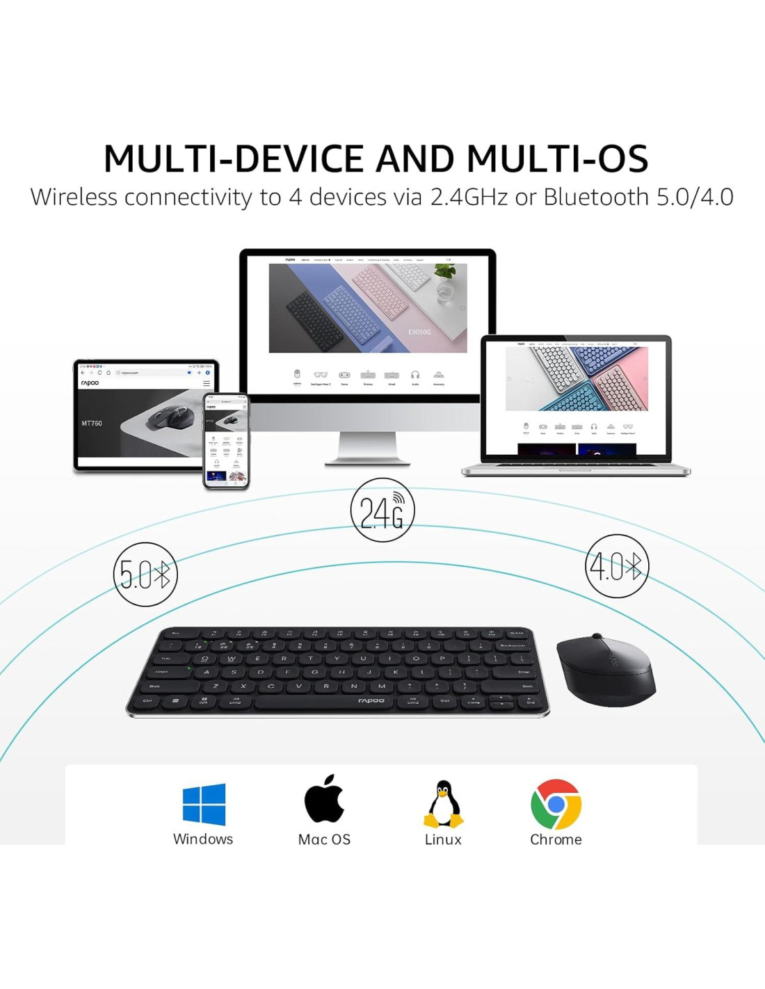 Conéctate hasta 4 dispositivos a través de OS (Windows, Mac, Chrome, Android) con solo presionar un botón. Obtén una conexión inalámbrica confiable y encriptada a través de Bluetooth o el receptor USB plug-and-play. Bordes redondeados cóncavos, escribe cómodamente con teclas chiclet silenciosas y de bajo perfil, similares a las de un portátil. 12 teclas FN soportan Windows y Mac OS, proporcionando acceso instantáneo a las aplicaciones más utilizadas. Agrega indicadores en el Dispositivo y Bloq Mayús, cambia fácilmente entre dispositivos y evita errores de contraseña. Forma esculpida para mayor comodidad con 5 DPI ajustables (800/1000/1200/1600/2400) para monitores de diferentes tamaños. Chip Bluetooth de bajo consumo mejorado para una mayor duración de la batería. Disfruta de hasta 12 meses usando solo 3 baterías alcalinas (2*AAA+1*AA) (incluidas). Diseño compacto de tamaño de tableta de 78 teclas, fácil de llevar en tu mochila o maleta, ideal para la escuela, viajes, negocios. Windows/Mac OS/Chrome OS/Linux/Android con puerto USB-A o habilitado para Bluetooth. ¿Cómo cambiar los modos inalámbricos entre Bluetooth 5.0/4.0 y 2.4GHz? Simplemente gira el botón de modo (BT/APAGADO/2.4G) según tus necesidades - puedes encontrar el botón de modo en la parte posterior del teclado y en la parte inferior del ratón. Bluetooth 5.0/4.0 se detecta y aplica automáticamente según la versión de tu dispositivo. ¿Cómo emparejar el teclado y el ratón con diferentes dispositivos? Modo 2.4GHz: simplemente conecta el dongle USB; Modo Bluetooth: mantén presionada la combinación de teclas (> 3 segundos) [FN]+[1], [FN]+[2], [FN]+[3] para emparejar el teclado con 3 dispositivos, mantén presionado el botón BT del ratón para emparejar el ratón - mantén el orden de los dispositivos consistente. ¿Cómo cambiar entre los 3 dispositivos Bluetooth? Presiona brevemente (< 3 segundos) la combinación de teclas [FN]+[1], [FN]+[2], [FN]+[3] para cambiar el teclado, y presiona brevemente el [Botón de Dispositivo] del ratón para cambiar el ratón entre 3 dispositivos Bluetooth. ¿Cómo cambiar las teclas de acceso rápido multimedia entre Windows y Mac OS? Windows: Presiona la combinación de teclas [FN]+[W]; Mac OS: Presiona la combinación de teclas [FN]+[Q]. 9010M 9050S 9360M 9560M 9900M Fundada en 2002, RAPOO ha estado involucrada en el desarrollo y fabricación de periféricos de computadora durante más de 20 años. La participación de mercado de teclados RAPOO es No.1 y la participación de mercado de ratones es No.2 en el mercado chino (Informe ZDC, 2022-2023). Nuestros productos son elegidos y confiados por más de 100 millones de clientes de más de 50 países y regiones. RAPOO se centra en preservar el mundo natural y construir un negocio sostenible para nuestros clientes y el planeta.