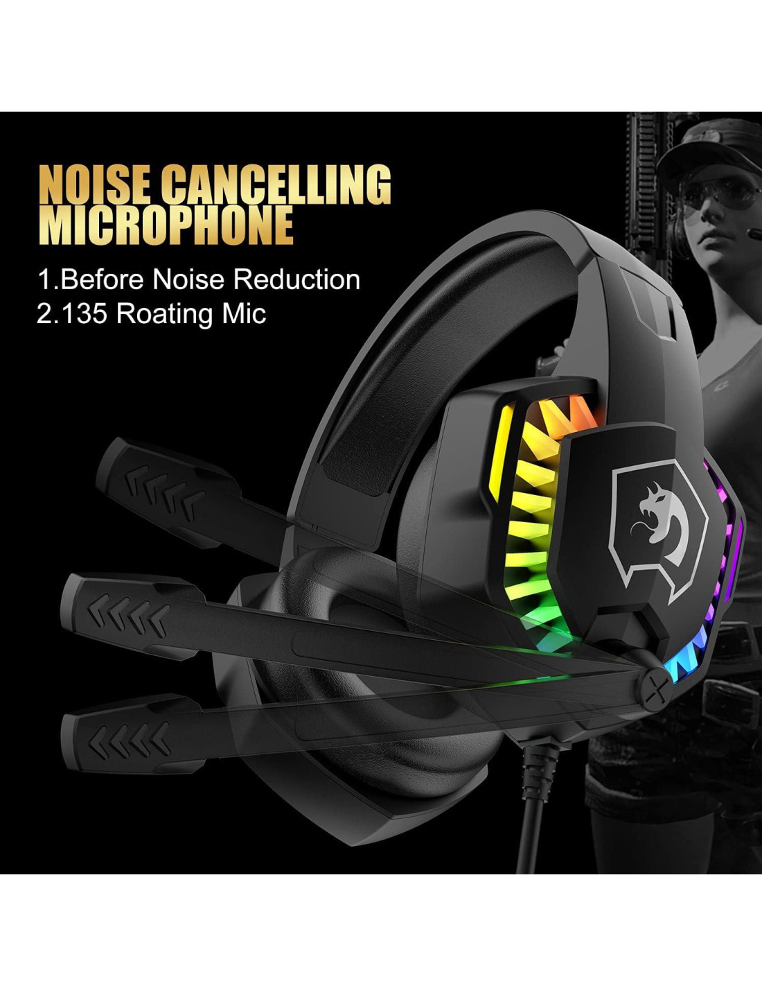 - Auriculares Gaming con Cancelación de Ruido: ANC reduce activamente el ruido, lo que reduce en gran medida la interferencia del ruido del entorno y hace que el sonido que escuchas sea más claro. Micrófono de 120, atenuando efectivamente el ruido del entorno, haciendo que tu voz sea más clara. Diseño ergonómico, ligero y cómodo. Efecto de iluminación RGB colorido. Cable USB: 2m