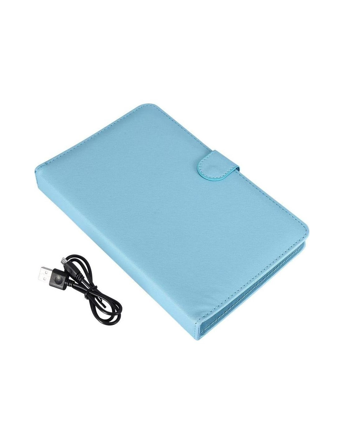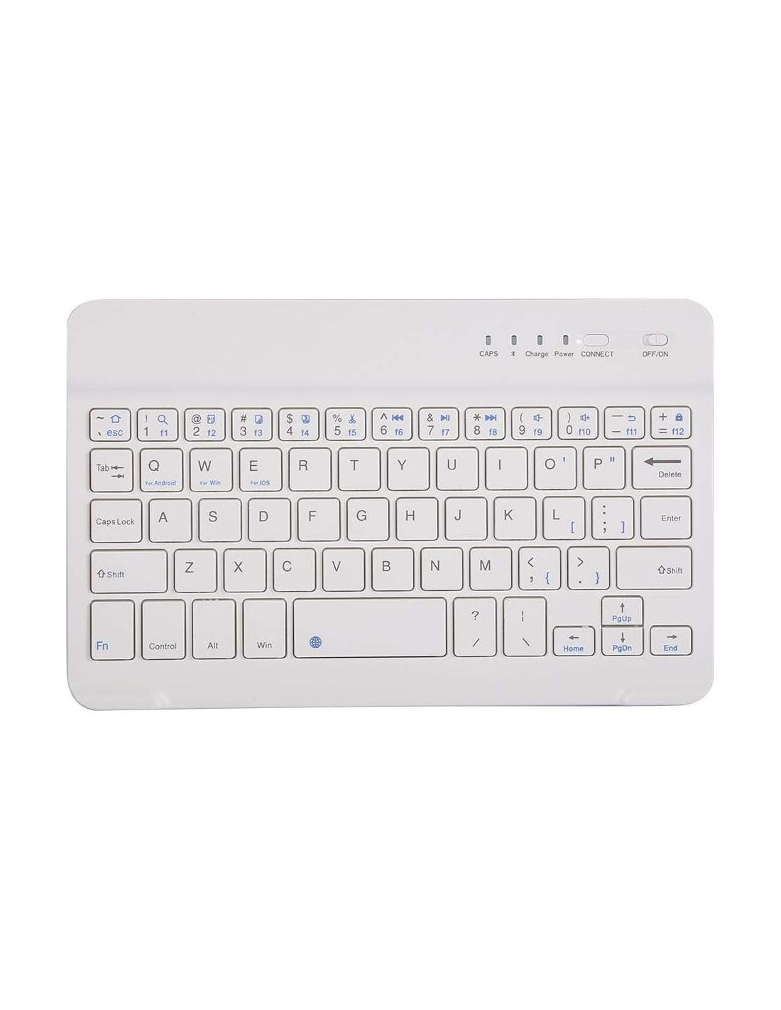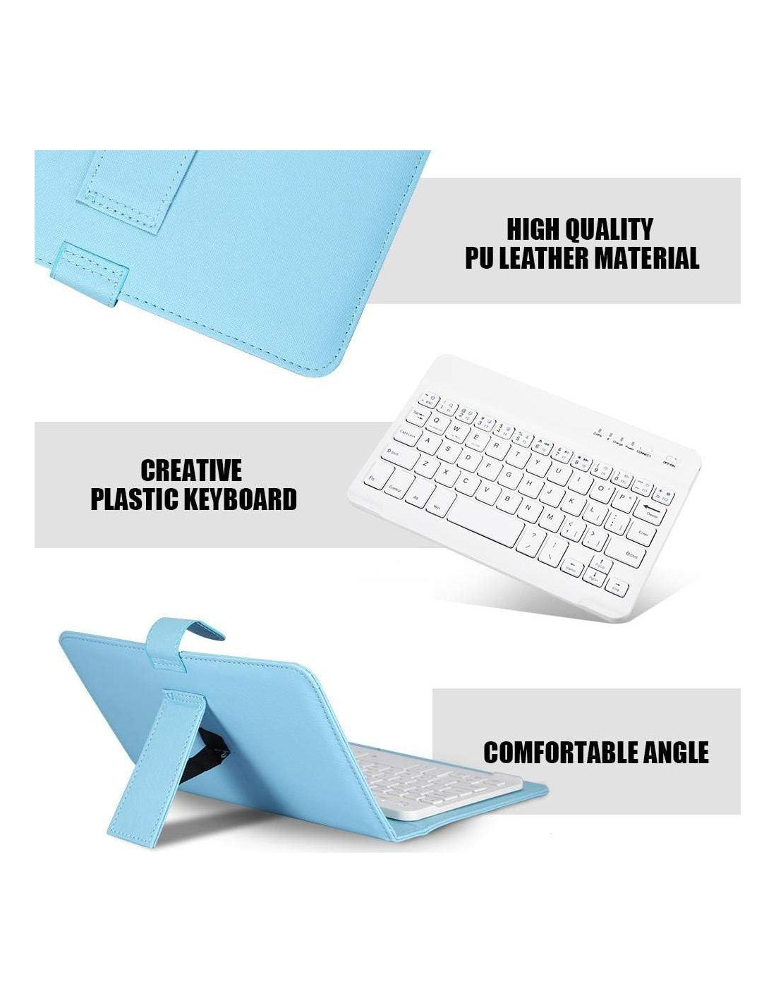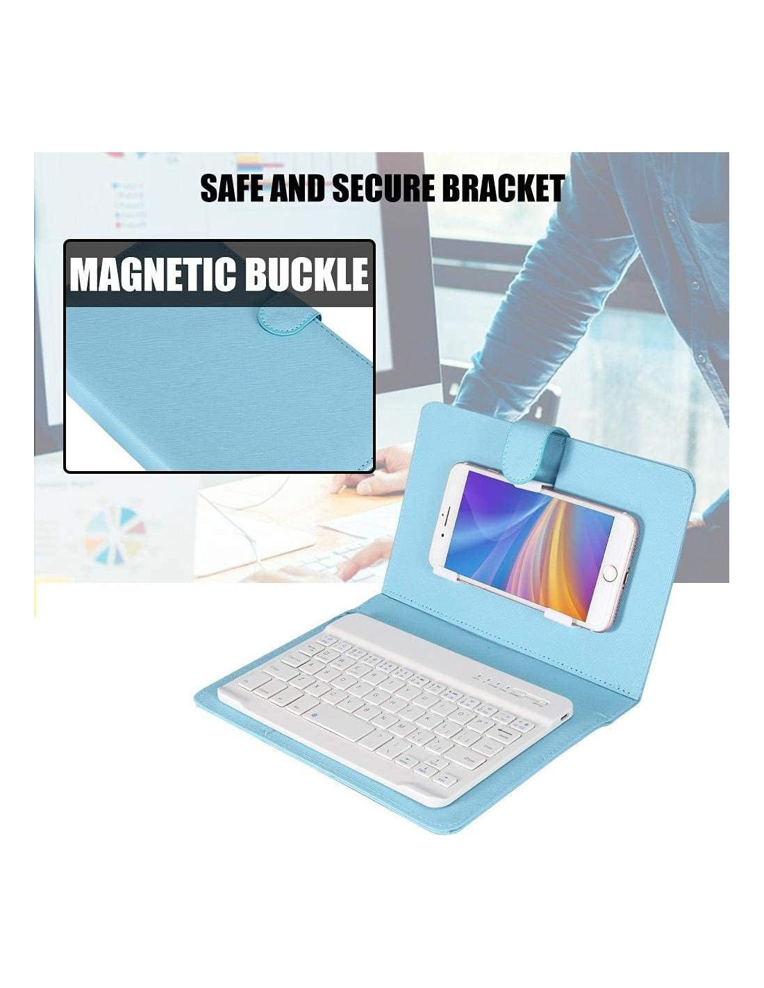 Este diseño de funda de soporte folio 2 en 1 + teclado Bluetooth 3.0 desmontable está diseñado para soportar tu celular en las manos para que puedas concentrarte en trabajar, leer, ver videos, escribir como en una computadora portátil normal. Además, la funda protege tu teléfono móvil de rasguños y roturas. El producto es adecuado para teléfonos celulares Bluetooth de 4.5in (11,43 cm) 6.8in (17,27 cm), incluyendo teléfonos Android e iOS. Especificaciones: Color: blanco, azul cielo (Opcional) Tipo: funda de teclado Bluetooth: tipo con tapa Material: funda de cuero PU, teclado de plástico: compatibilidad empresarial: compatible con teléfonos celulares Bluetooth de 4.5'' (11,43 cm) 6.8'' (17,27 cm), incluyendo teléfonos Android e iOS Bluetooth: 3.0 + estándares HS Certificación: BQB, FCC, CE, ROHS Distancia efectiva: hasta 10M (espacio abierto) Modulación: 2.4GHZ Voltaje de trabajo: 3.0 5V Corriente de trabajo: <4.0MA Corriente en espera: 20UA Corriente en modo de suspensión: <2A Corriente: 100mA. Tiempo de espera: 100 días: 80 +/- 10g Vida útil de las teclas: hasta 5 millones de veces. Temperatura de funcionamiento: 10 +55 Humedad: 20% 50% Interfaz: puerto Micro USB Idioma: Inglés Luz indicadora de energía: luz roja encendida en estado de carga; luz apagada completamente cargado; luz intermitente bajo estado de electricidad para recordarte que cargues. Peso del paquete: 334g Lista del paquete: 1 * Teclado Bluetooth y Funda 1 * Cable de Datos