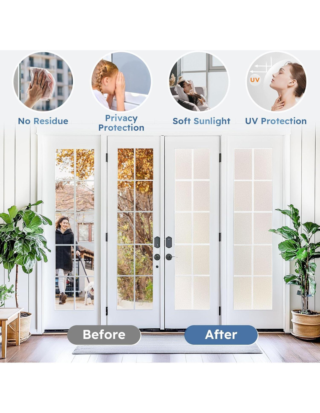 - Privacidad Total, Luz Natural: Nuestra película para ventanas esmerilada bloquea miradas curiosas y perros ladrando mientras deja que la luz natural y suave ilumine tu espacio. Disfruta de privacidad 24/7 sin sacrificar la iluminación natural