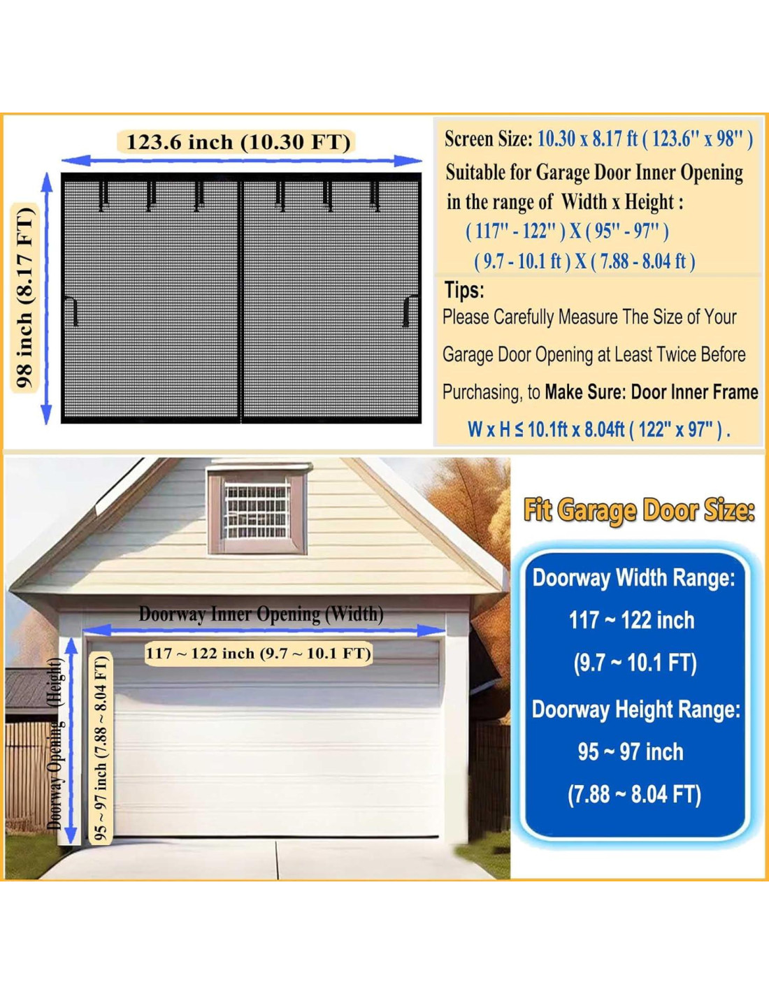- [COMPATIBILIDAD DEL TAMAÑO DE LA PUERTA] - El tamaño de esta pantalla de puerta de garaje magnética es de 10.30x8.17ft (124" x 98"), y el tamaño máximo de puerta adecuado es de hasta 122" x 97". La malla de fibra de vidrio está hecha de material de alta densidad, fuerte y duradera. Si el tamaño es correcto, también es adecuada para acceso frontal, trasero, interno o externo, terrazas, porches, balcones, etc. Nota importante: ¡Por favor mide tu garaje dos veces antes de ordenar!